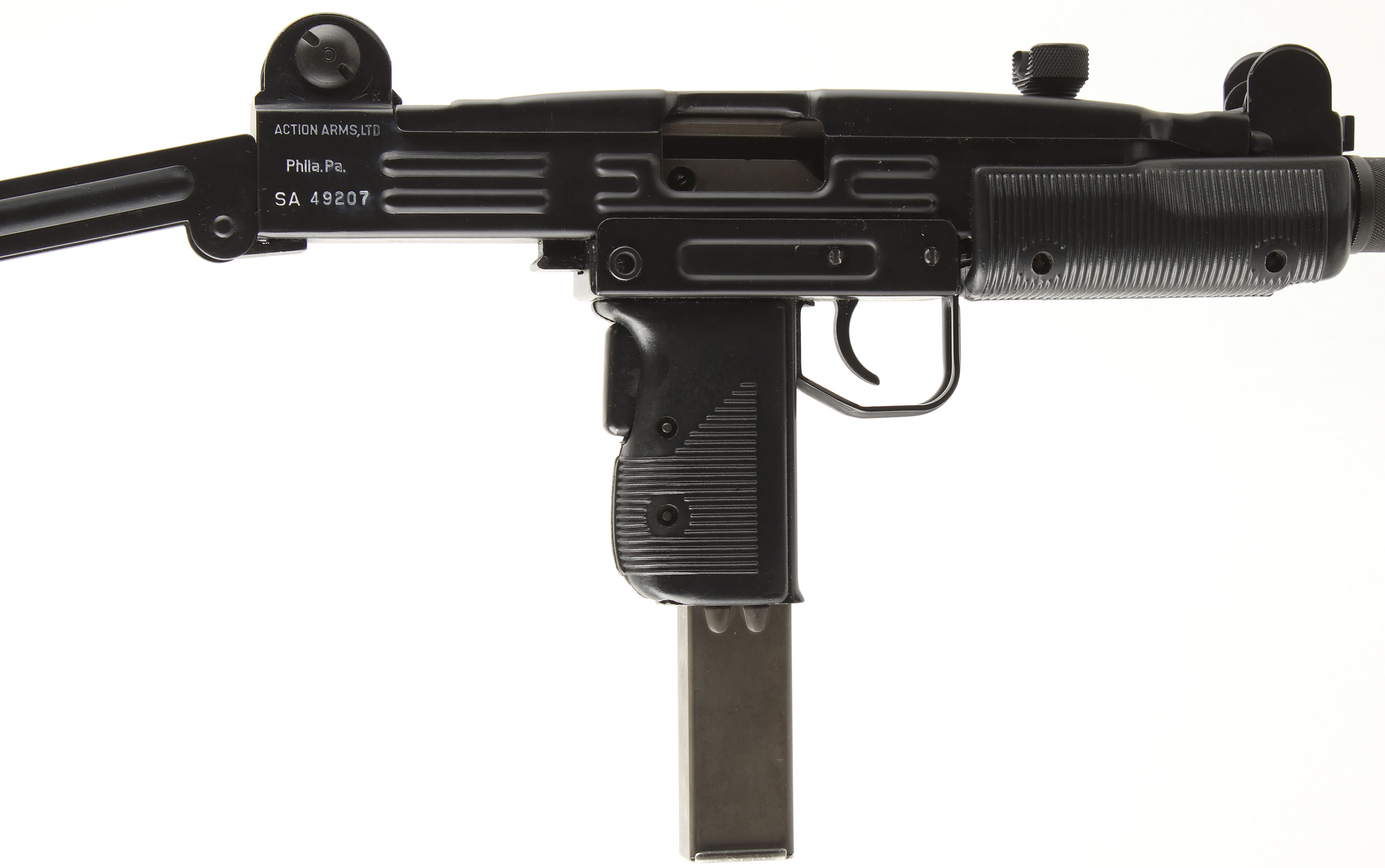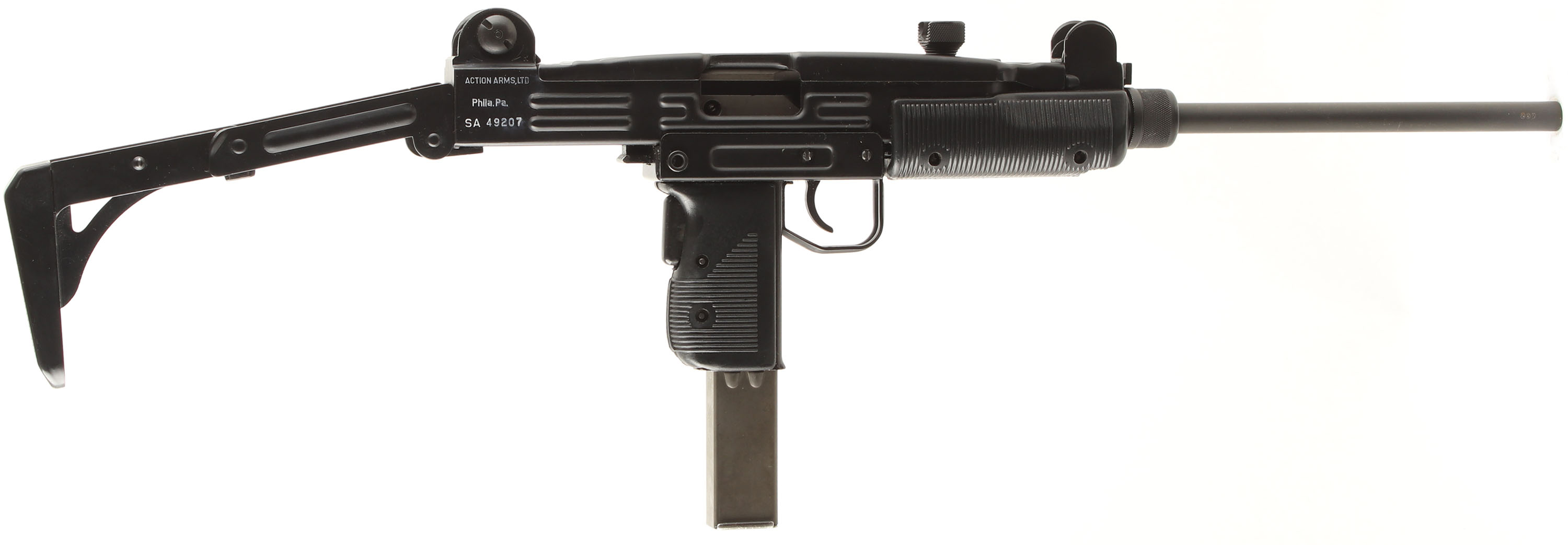 IMI- Israel (Action Arms Import), Model: Uzi Semi-auto Model B, Cal: 9x19mm, MFG: 1983-89, S/N: SA49207, Semi-auto rifle, 16 1/8'' barrel. The grooved black polymer pistol grip & foregrip are excellent with a couple minor scuffs & light handling wear. Metal folding buttstock. The parkerized finish on the barrel rates 92% with light rust speckling. The black paint finish on the rest of the metal rates 98% with a few light scratches. The left side of the receiver is marked ''UZI semi auto'', ''MODEL B'', ''9mmPARA'', ''IMI-ISRAEL''. The right rear side of the receiver is marked ''ACTION ARMS,LTD'', ''Phila.Pa.'', & the S/N. the right end of the barrel is marked with a ''P'' in circle, & the last three digits of the S/N ''207''. The bore is very good. Its bright & mirror like with a couple spots of light pitting. The receiver holds a elevation adjustable post front sight with protective ears, & a windage-adjustable, aperture flip up L sight with 100 & 200 meter positions. The folding buttstock has carries no buttplate, but the shoulder end is grooved for better control. The gun appears to be in full working mechanical order. Comes with a 32 Rd. steel mag. FFL Req. - Value: 1500 to 3000