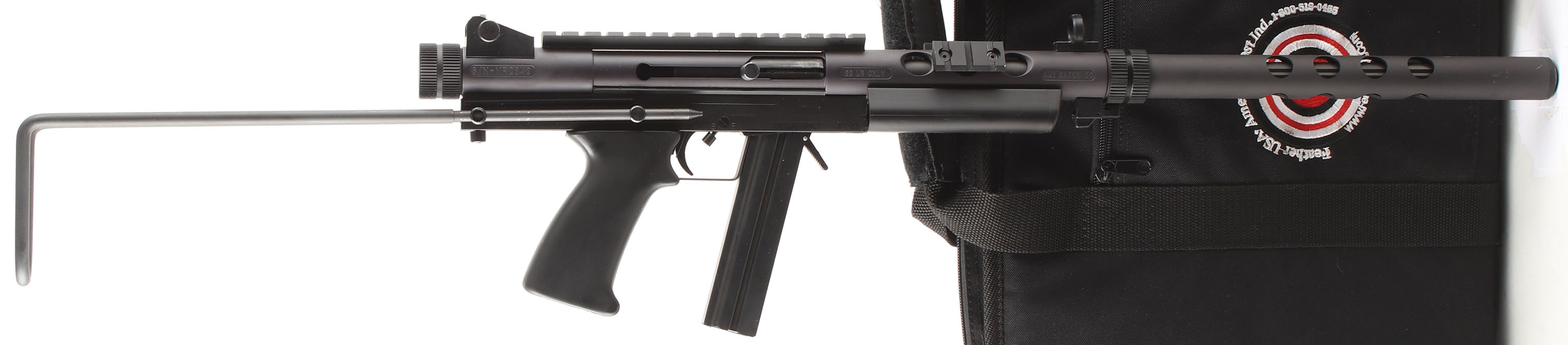 CASED, AWI Eaton Co (Feather Industries), Model AT-22 ''Rav-22LR'', CAL: 22LR, MFG: Modern, SN: MP2842, Semi Auto Rifle, 17'' barrel. The synthetic black pistol grip is excellent. The matte black finish on the frame/receiver rates 99%+. The matte black finish on the barrel & heat shield rates 95%, with handling marks from honest use. Bore is excellent. Factory sights. Factory picatinny rails for optics & accessories. Comes in a factory soft carrying case, with related paperwork & unopened 20rnd mag. A neat little semi-auto take-down rifle. FFL Req. - Value: 300 to 400