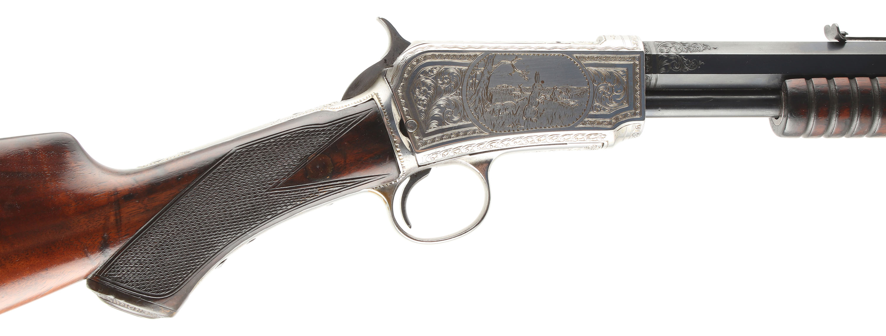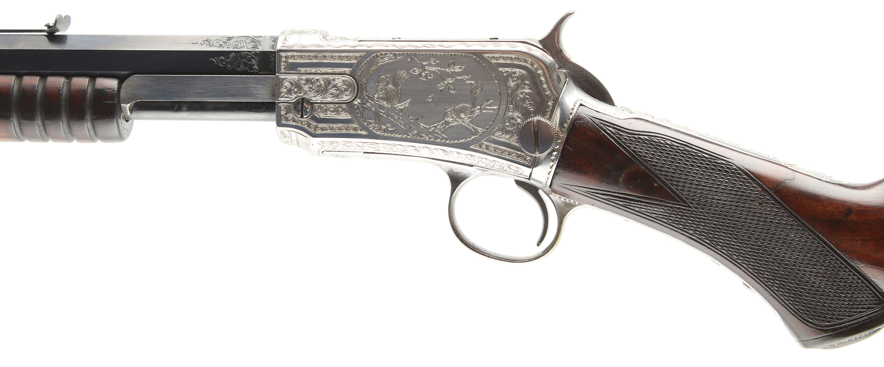 FANTASTIC NICKEL ENGRAVED Winchester, Model 1890 2nd model, .22 WRF Cal., MFG. 1907, SN: 329524, Pump Action Rifle, 24'' Tapered Octagon barrel, The receiver, barrel & trigger guard are elaborately scroll engraved, with forest scenes depicting two squirrels on the left side of the receiver & three rabbits on the right side. This engraving is as shown on pg. 125 of ''Winchester - An American Legend'' by R. L. Wilson as being Winchesters No. 8 style, ''Especially suitable for rifles having small frames, such as the Model 1890 & the Single Shot''. Band & small scroll engraving is displayed on all flats of the barrel, with additional 1'' scroll on four side flats & 2'' of scrolls on the top flat beyond the caliber marking. Neither the top of the receiver or the barrel are proof stamped as you would expect on a factory engraved rifle. The deluxe original capped pistol gripped walnut stock has Winchester' fancy ''H'' style hand checkering. The stock exhibits fantastic grain. There is a dowel sized repair (restoration), one on each side of the wrist, where a pin through the wrist once resided for known reason. Does not appear that it was necessary for stability, as the wrist is structurally sound. However, there is a small 1'' tight stress crack off the left side of the upper tang & running downward into the checkering on the wrist. The stock appears to carry an added layer of finish, likely added at the time of the wrist restoration. The corncob forearm & its finish appear original with use thinning of the finish & darkening at areas of finish loss. Overall, the socks present very well. The metal blue finish appears to have been restored, rating 90% on the barrel & mag tube, with some spotting, speckling or light pitting in areas. The nickel on the receiver rates excellent, with some thinning on the sides & inside the trigger guard. Bore is excellent. Factory front & rear sights. The left side of the lower tang under the wood is stamp ''3925X'', the ''X'' marking it as a deluxe wood rifle. The ''3925'' is also stamped on the buttend of the wood stock & on the inside of the buttplate. These numbers are the first four digits of the SN, but oddly stamped ''3925'' rather than the ''3295'' of the actual SN. There is some question to whether this rifle was factory engraved or the professional Custom engraving of a factory deluxe rifle. It is honestly very difficult to determine from simple examination. The engravings & stampings are sharp as you'd expect from the factory. If it is custom engraving outside the factory, the current blue would have been done after the engraving. Without the proof a factory standard or deluxe rifle, one would infer that the receiver was pulled from standard production before proof stamping for factory custom shop engraving. Regardless, it is truly a wonderful nickeled engraved 1890 rifle, that presents very sharply & is in excellent condition. FFL or C&R Req. - Value: 5000 to 8000