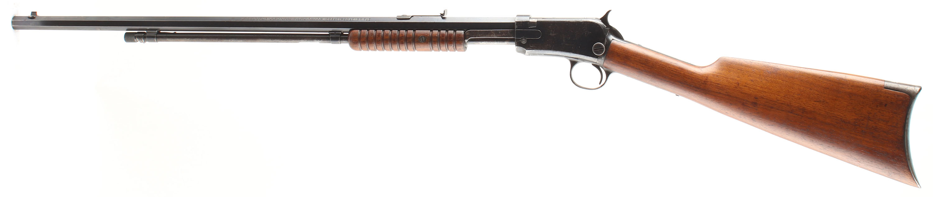 Winchester, Model 90, .22 LONG RIFLE Cal., MFG: 1923 SN: 689947, Slide Action Pump, 24'' Tapered octagon barrel. The L.R, only caliber is the rarest & most desired caliber amongst collectors as only 10% of total production was this caliber. The L.R. caliber was added in the mod 90 line-up in 1919. The original wood stocks are excellent, with several minor handling marks, scratches & light contusions to the original finish. The original metal blued finish rates 90% on the barrel, 60% on the receiver, & 30% on the mag tube, with loss on the receiver due to scratches & wear. Bore is excellent. Barrel carries the original front & rear sights. Factory crescent steel buttplate. Excellent original example of a single caliber 90 remaining in very high collectible condition. FFL or C&R Req. - Value: 1000 to 2000