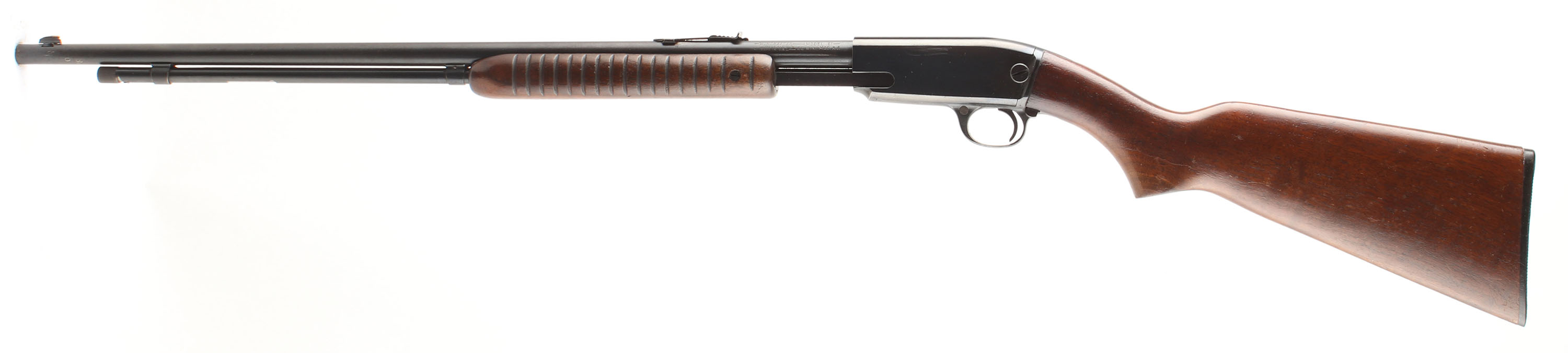 Winchester, Model 61, Marked .22 WIN. MAG. R.F., MFG. 1960, SN: 301054, Pump Action Rifle, 24'' round barrel, Grooved receiver. Desirable single caliber marking, with .22 Win Mag being the most desirable in the round barrels. The original flat pistol grip wood stocks are excellent, with a few minor scrapes, scratches & contusions to the original finish. The metal blue finish rates 90% overall. Toning a bit gray on the barrel as it thins & some speckling on the receiver. Bore is excellent & bright. The barrel carries an adjustable rear & elongated blade front sights. Factory checkered plastic buttplate. A very nice original example & collectible Win Mag caliber. FFL or C&R Req - Value: 800 to 1200