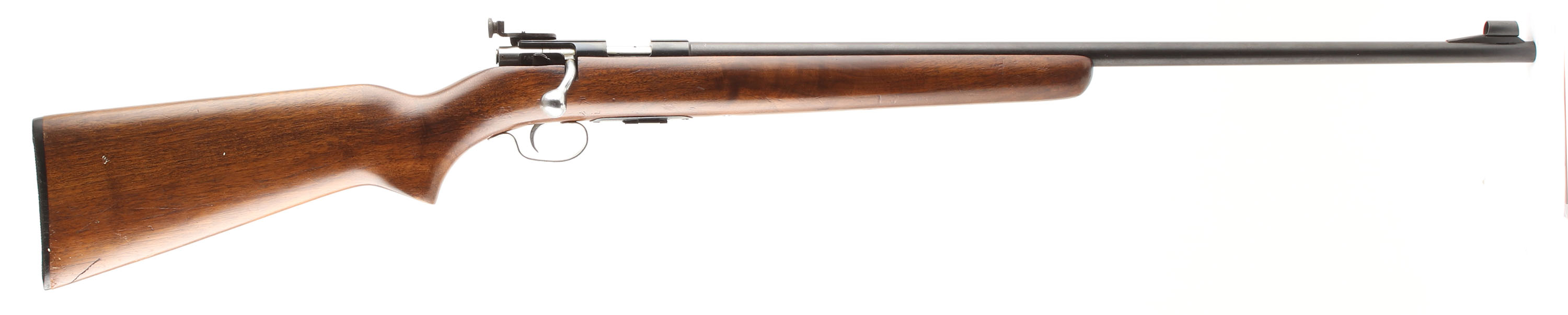 Winchester, Model 69A, CAL: 22 S,L,LR, MFG: 1935-63, SN: NONE, Bolt Action Rifle, 25'' barrel. Grooved receiver. The flat pistol grip & blunt nose forend wood stock is excellent, it exhibits the original finish, with several minor scrapes, scratches & contusions. The original metal blue finish rates 90% on the receiver & 85% on the barrel. Bore is excellent. The rifle is fitted with the correct receiver mounted aperture disk rear sight & hooded ramped blade sight. Buttstock carries a Winchester marked, checkered black plastic buttplate. Nickeled bolt handle, trigger & trigger guard. Comes with a Winchester stamped detachable magazine. FFL or C&R Req. - Value: 300 to 600