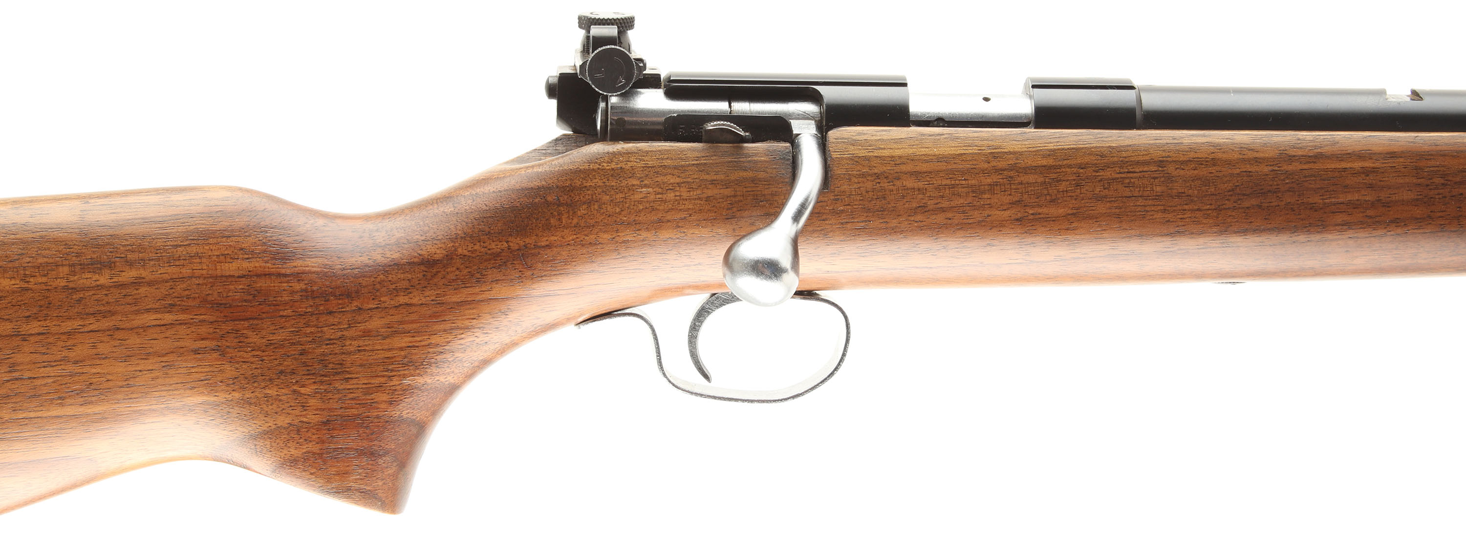 Winchester, Model 72A, .22 S, L, LR Cal., MFG. 1938-59, SN: None, Bolt Action Tube Fed Rifle, 25'' round barrel. The factory flat pistol grip wood stock is excellent, with very few tiny handling marks to the excellent original finish. The factory metal blue finish rates 98% overall. Bore is excellent, The rifle carries a side mounted receiver sight, while the barrel has an open rear dovetail & standard front sight. Original black plastic buttplate. Nickeled bolt, bolt handle, trigger & trigger guard. Excellent overall. FFL or C&R Req. - Value: 300 to 600
