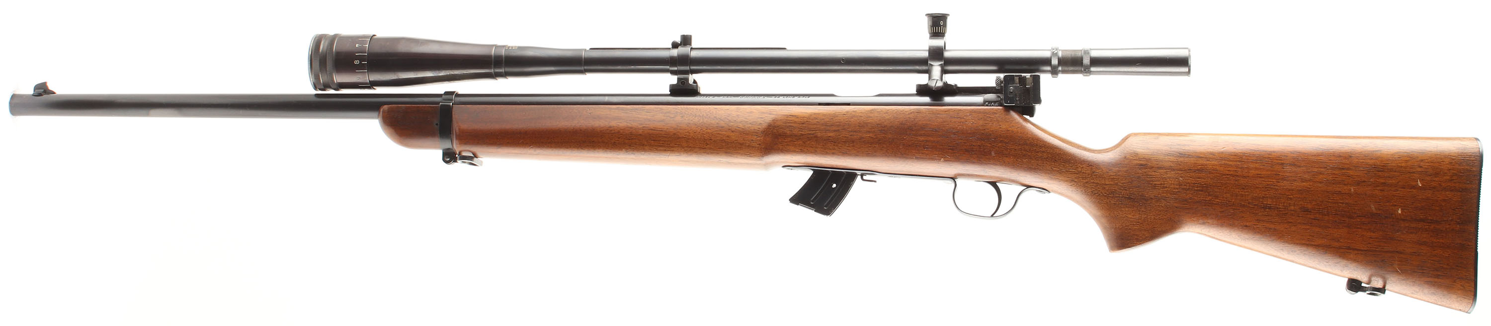 Savage, Model 19 N.R.A., CAL: .22 LR, MFG: 1919-33, SN: 50650, Bolt Action Rifle, 25 1/2'' barrel. This rifle was collaboration between Savage & the NRA to create a high-quality, match-grade rifle for smallbore competitions. The original flat pistol grip wood stock is excellent, with minor scratches & scuffs to the excellent finish. There is an oil run in the finish behind the bolt handle down to the trigger. The original metal blue finish rates 98%. The rifle is fitted with a Lyman Junior Targetspot 8 Power scope, the receiver is fitted with a Lyman receiver sight base, without the sight, & the barrel carries a blade front sight. Bore is excellent. Buttstock carries a grooved metal buttplate. Sling loops in stock & on front barrel band. Detachable mag. Excellent Overall. FFL or C&R Req. - Value: 300 to 600