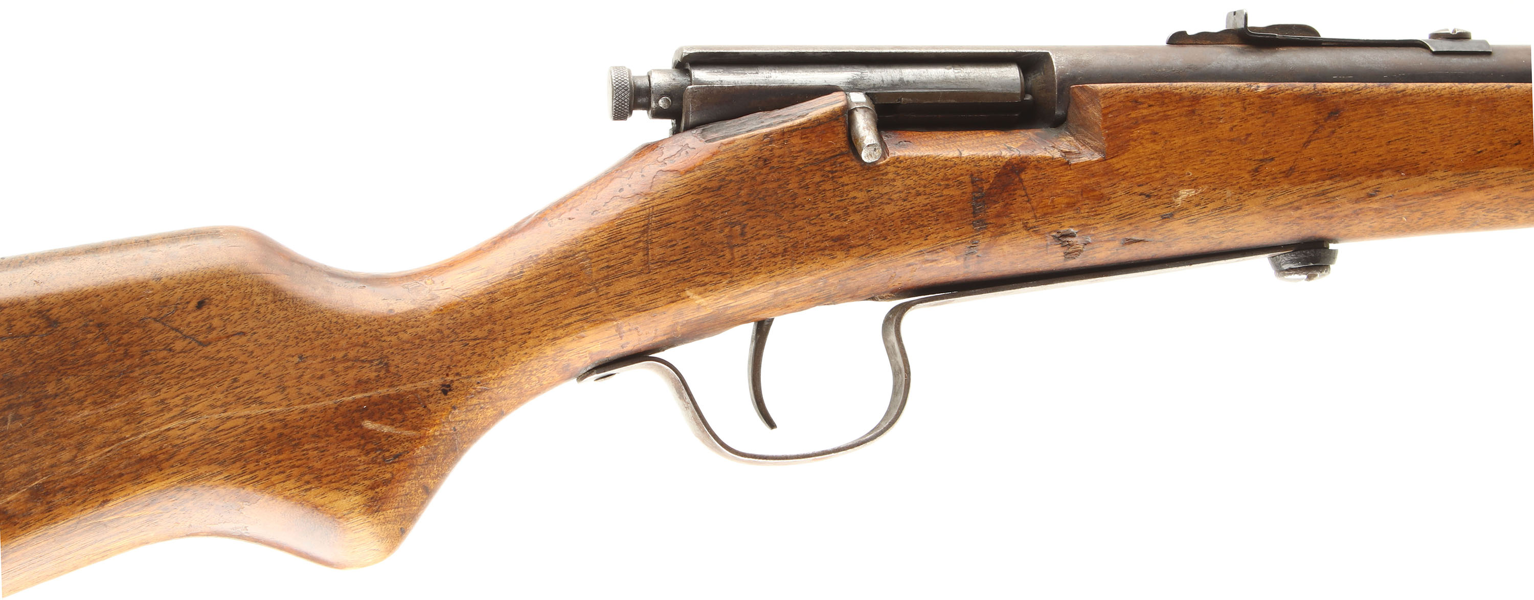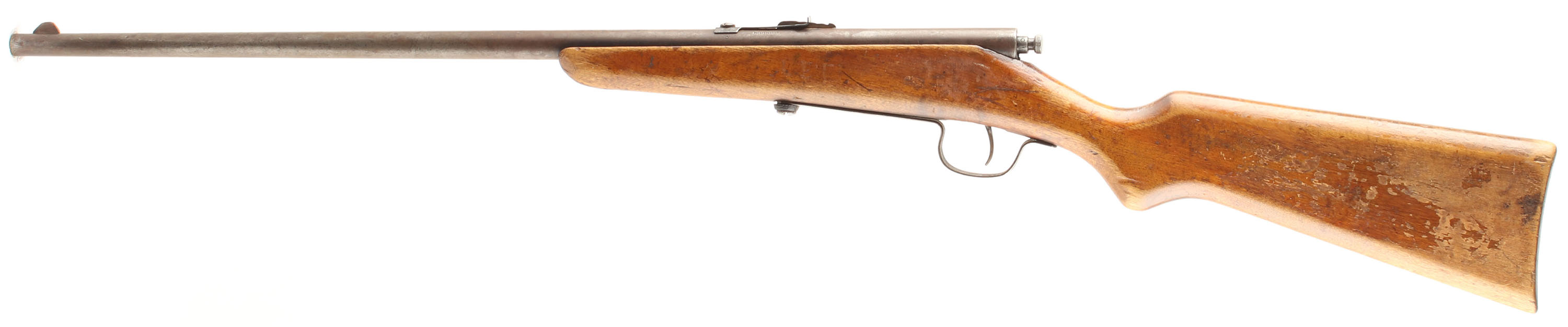 Springfield (J. Stevens Arms Co.), Model 15, .22 S, L, LR Cal., MFG. 1930-47, SN: None, Bolt Action Single Shot Rifle, 22'' round barrel. The replaced rounded pistol grip wood stock fair & solid, but has been crudely modified to fit the bolt & trigger. There are several minor to small scrapes, contusions & scratches to the thinning & flaking finish. The metal blue finish has worn gun metal gray, with a thin brown patina. Bore is very good. The barrel caries an adjustable rear & front blade sight. The bolt handle has been cutoff mid shank, but still functions. Stock was produced without a buttplate. A very basic, but functioning .22 rifle. Rifle is being sold ''AS-IS'' with NO RETURN. FFL or C&R Req. - Value: 25 to 50