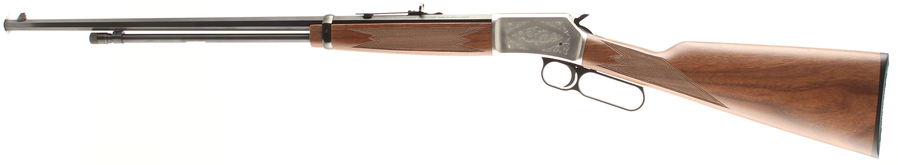 BOXED Browning, Model BL-22, GRADE II, CAL: .22 S.L.LR., MFG: Modern, SN: BRJP02870, Lever Action Rifle, 24'' Octagon barrel. 3/4 Mag. The original deluxe checkered, straight grip walnut stocks are minty. The original metal blue finish rates 100% overall. The silver receiver displays scroll engraving. Bore is excellent. The barrel carries factory folding rear & blade front sights. Buttstock carries a Browning plastic buttplate. Gold trigger. Comes in the original SN matching box, with paperwork & lock. Basically NOS. FFL Req. - Value: 1200 to 1400