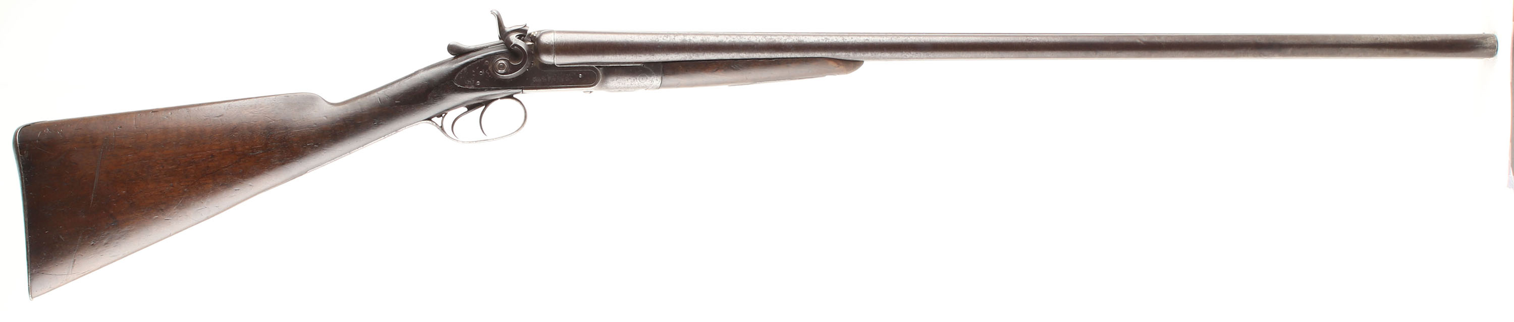 Colt, Model 1878, CAL: 12GA, MFG: 1878-89, SN: 21952, Break Action SxS, 30'' barrels. The side plates are marked ''COLTS PT F.A. MFG CO''. The original straight grip wood stocks are good & solid. There are minor edge chips along the buttplate, with numerous contusions, scratches & scrapes throughout. The forend has a couple good smoothed gouges. The laminated/twisted steel pattern on the barrels is visible, but the barrels have mostly toned to a dark brown patina, with consistent spotting & speckling. The side plates have also toned to a dark brown patina. Bores are fair, consistently rough, with pitting. The solid ribs holds a front bead. Stock has a smooth metal buttplate, with rust spotting/speckling. The break open is a little sticky, & is sometimes hard to open & there is a small amount of play between the barrels & receiver. Double triggers. The left hammer doesn't appear to hit the firing pin, it looks like it gets hung up on the sideplate screw just ahead of the hammer. Shotgun has some difficulties unlocking & opening. We recommend this firearm be inspected by a licensed gunsmith before use. SOLD AS IS NO RETURNS. Antique, No FFL Req. - Value: 300 to 600