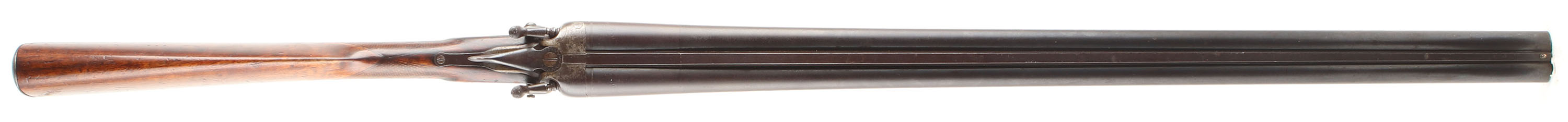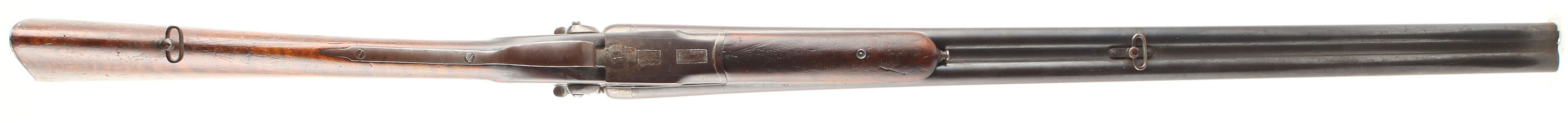 Fuile Rinforzato Hammer Double CAL; 12GA, MFG: N/A, SN: 95679, Break Action SxS, Choke: Full/Full, 27 1/2'' barrel. The side plates are marked with the makers name, the bottom of the receiver is marked ''MONOBLO BERETTA/BRESCIA'' & the barrel is marked ''P.BERETTA GARDONE V.T BRESCIA''. The original checkered straight grip stocks are very good & solid, having been sanded & refinished. There are numerous contusions, dings, scratches & scrapes throughout. The blued finish on the barrels has full toned to smooth brown patina. The nickeled receiver & side plates have remnants of nickel finish in heavily protected areas, but mostly worn to metal gray & toned to a brown patina. Bores are poor, bright, but heavily pitted. The Solid matted rib holds a front bead. Stock has a Beretta grooved metal buttplate. Sling loops. Double triggers. FFL or C&R Req. - Value: 200 to 400