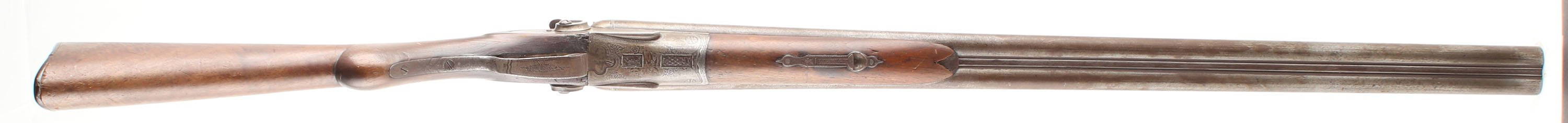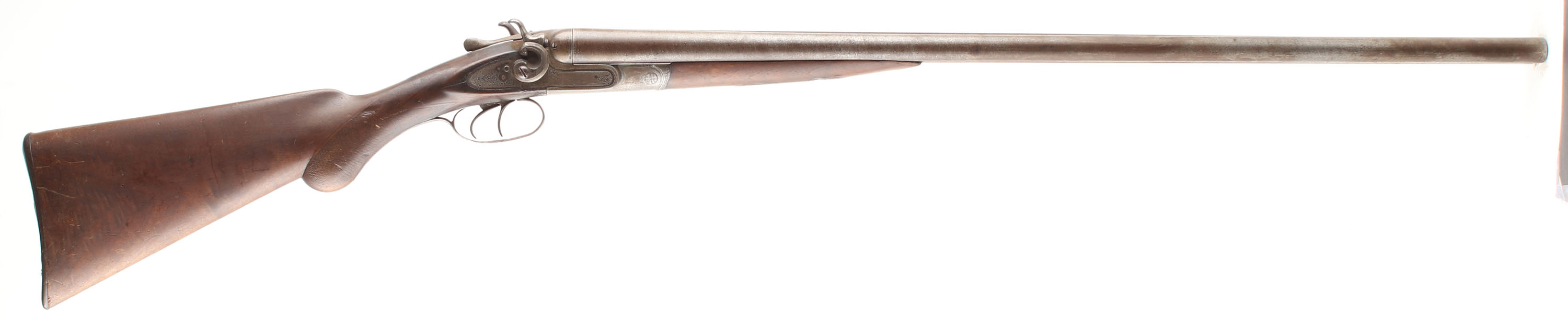 Ed Parker, Hammer Double, CAL: 12GA, MFG: 1880's-1900's, SN: 613, Break Action SxS, Choke: Full/Mod, 30'' Damascus barrels. The side plates are marked ''ED PARKER'' & the barrel rib is marked ''ED PARKER LONDON FINE DAMASCUS''. British proofs on the water table. The original checkered round knob wood stocks are very good & solid, having been sanded & refinished. There are a few small grain cracks coming off the side plates/upper tang, edge chips, smoothed contusions, scrapes & dings throughout. The forend ebony tip is missing. The fingerprint Damascus pattern on the barrels is visible & the browned finish has worn to an uneven mix of remaining finish & metal gray. The receiver has also fully worn to metal gray & toned to a brown patina. The receiver, trigger guard, side plates, break lever & forend release lever all display simple ornamental hand engraving. Bores are poor, dark & pitted. The solid matted rib holds a front bead. Stock has a worn horn buttplate. Double triggers. There is a good amount of play in the break lever. You can easily slide it to the open or closed position without any tension. There is also play between the barrels & receiver, they don't lock up tight. We recommend this shotgun be inspected by a licensed gunsmith before use. SOLD AS IS NO RETURNS. FFL or C&R Req. - Value: 200 to 400