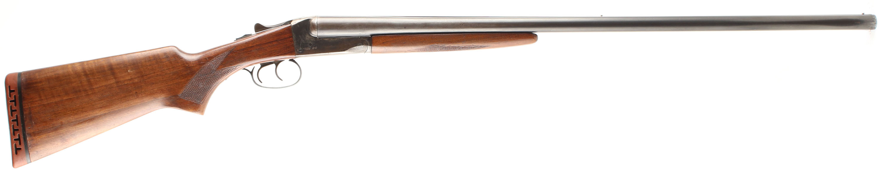 Ward's Western Field (Stevens), Model 52-SB311-TA (Model 311A), CAL: 12GA, MFG: 1951, SN: NONE, SxS Shotgun, 2 3/4'' Chamber, 30'' barrel. The checkered flat pistol grip stocks are excellent, having been refinished at one time. There are contusions, scrapes & dings throughout. The blued finish on the barrel rates 50% & the receiver rates 40%, with a thick black finish remaining in the crevices of the barrel rib. Bores are very good & bright, with intermittent patches of roughness. The solid matted rib holds a small mid-rib bead & front bead. Stock has a ventilated recoil pad. Double triggers. The side of the barrels don't sit flush to the shoulders on the receiver. We recommend this shotgun be inspected by a licensed gunsmith before use. SOLD AS IS NO RETURNS. FFL or C&R Req. - Value: 100 to 250