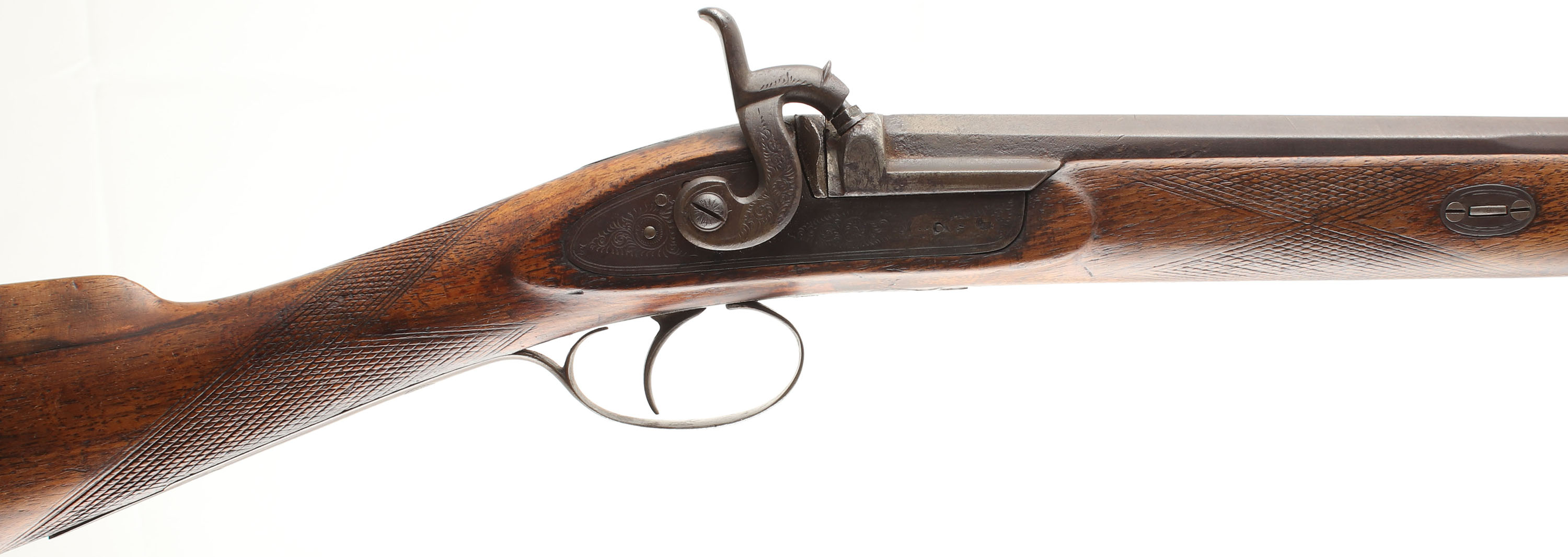 CONDITION: The checkered, straight wrist walnut stock is very good with light nicks, dings, & scratches from use/age. The wood has also slightly shrunk over time leaving the metal proud to the wood around the buttplate & lower tang. Silver medallion embedded into belly of stock. The metal has toned to a chocolate brown patina, with areas of roughness/pitting scars near percussion nipple. The top of the barrel is marked ''THE IMPERIAL SPECIAL''. The marking is faded but still present. The lock plate is marked ''HUDSON BAY Co.'', this marking is worn & the ''BAY Co.'' is heavily faded but still present. The bottom tang is marked with the S/N, again this marking is worn but still present. British BV & BP proofs under barrel. The rear of the barrel, upper tang, trigger guard, lock plate, hammer, buttplate, screws & ram rod escutcheon, all have intricate ornamental engravings. The bore is poor, has rust & pitting. The barrel holds a bead front sight. The stock carries a steel buttplate, toned brown with light roughness. Stock has no sling attachments. Gun has a brass tipped, wooden ramrod. Muzzleloader/ Antique, No FFL Req - Value: 600 to 1200
