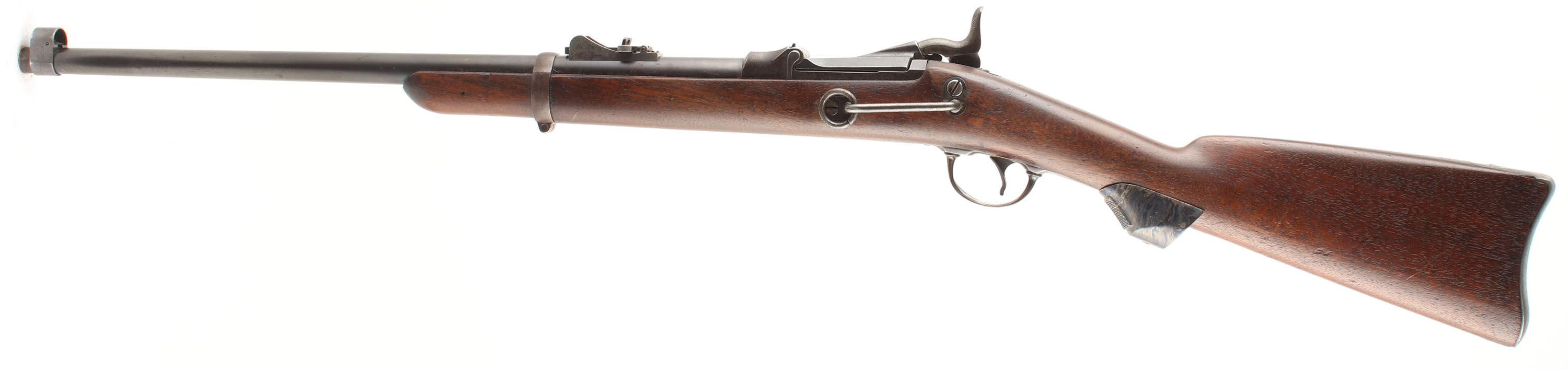 CONDITION: The straight wrist walnut stock is very good with small nicks, dings, & scratches from use. Stock is a cut down rifle stock with a 4'' wood fill in the cleaning rod channel in the forend of the stock (The buttstock cleaning rod was also introduced by the M1879, does not have it). Small wood fill repair at the forward end of the lock plate cutout. No visible inspector cartouche on the left flat of stock. The bottom of the wrist is stamped with the ''P'' in circle firing proof, toe & heel of the stock are stamped ''28''. The metal carries a arsenal re-finish with thinned markings & spots of roughness under the finish. The blued finish on the barrel rates 80% with some scratches & spots of thinning starting to tone brown. The receiver has toned to a dark patina with light roughness. has toned to a mix of gun metal gray & dark gray patina with light roughness across the metal. Breech block was re-blued (instead of case-hardened) at some point (unknown if its from a arsenal or after the fact) with roughness under the finish, the finish rates 85% with some spots of wear showing gray & is starting to tone brown. The breech block is marked ''US'', over ''MODEL'', over ''1873''. The rear of the receiver has the S/N. right side of the receiver marked ''LCB'' (marking slight obscured by stock). left side of the chamber has the very faint remains of the ''V'', over ''P'', over a eagle's head marking, ''P'' proof under that is thinned but fully present. The lock plate is marked with a American great eagle next to ''US'', over ''SPRINGFIELD'', over ''1873''. Markings are thinned with the eagle barely present. Barrel bands is marked ''U''. Three-click action. The bore is good. It's bright & shiny with thinned rifling & spots of roughness. The barrel holds a barleycorn front sight with the M1879 notched ramp base/flip up ladder ''buckhorn'' rear sight. Ladder stamped ''C'' for carbine & marked out to 1500 yards. The stock carries a blued steel non-buttplate (should be by the M1879 with a cleaning rod inside). Plate has toned to a mix of gun metal gray & brown patina. Rifle has a sling bar & ring. Mechanical function appears solid. A nice Springfield trapdoor presenting as a M1879 trapdoor carbine Antique, No FFL Req - Value: 400 to 800