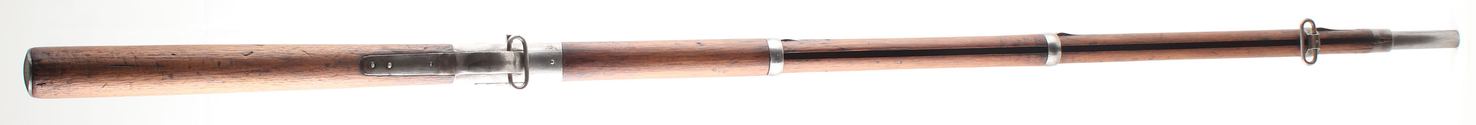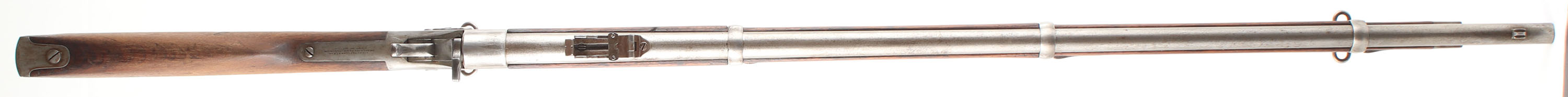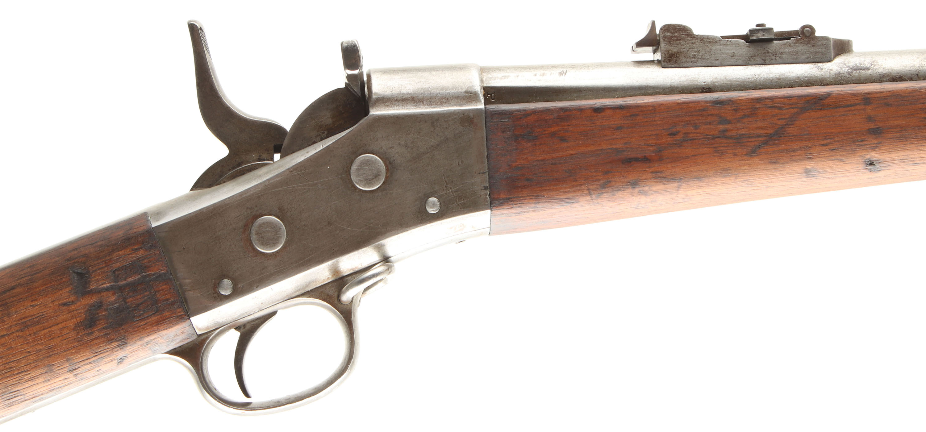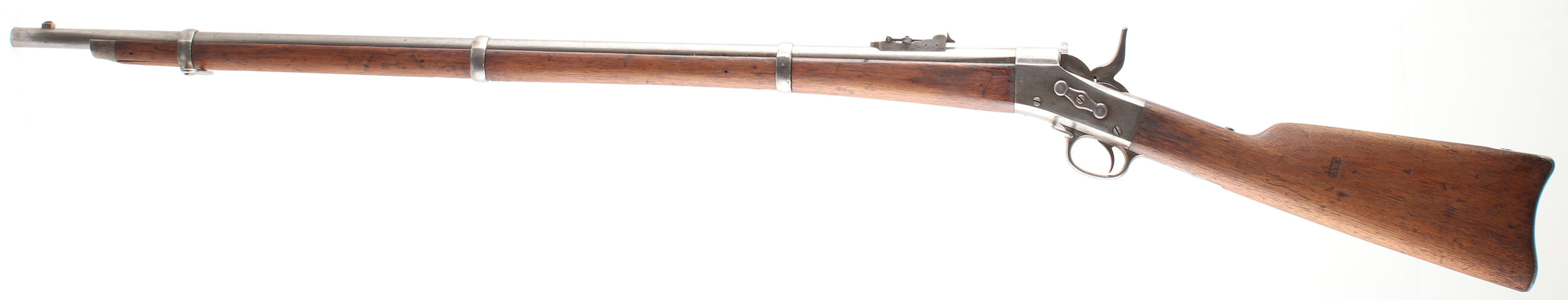 CONDITION: The two-piece, straight wrist walnut stock is very good with nicks, dings, & dents from use/age. There is a 1 1/2'' crack at the tip of the forend. There is a faded inspectors cartouche on the left wrist, left cheek, & right wrist, right cheek stamped with the rack number ''7''.The metal appears to have been buffed clean as some point. The metal is mostly gun metal gray with speckled patina, there is slightly more concentrated roughness in spots along the stock line. Left side of the receiver is stamped ''B''. The upper tang is marked with the three line 'REMINGTON'' address & patents ending in ''NOV. 7th 1871''. The left side of the chamber has a ''S'', the right is stamped ''P''. the rear sling loop has patent info on it & all barrel band stamped ''B'' on the left & right, rear band is marked ''H'' instead of ''B'' on the right. Rear sight marked ''B''. The bore is good. its bright & shiny with lightly thinned rifling & roughness. The barrel holds a worn small barleycorn front sight with a stepped base/ladder aperture rear sight marked 1 to 4 on the base & 5 to 10 on the ladder. The stock carries a steel buttplate, mostly toned gray with some brown patina. The rifle has both factory sling loops, but is missing the cleaning/clearing rod. Mechanical function appears solid. Antique, No FFL Req - Value: 1000 to 2000