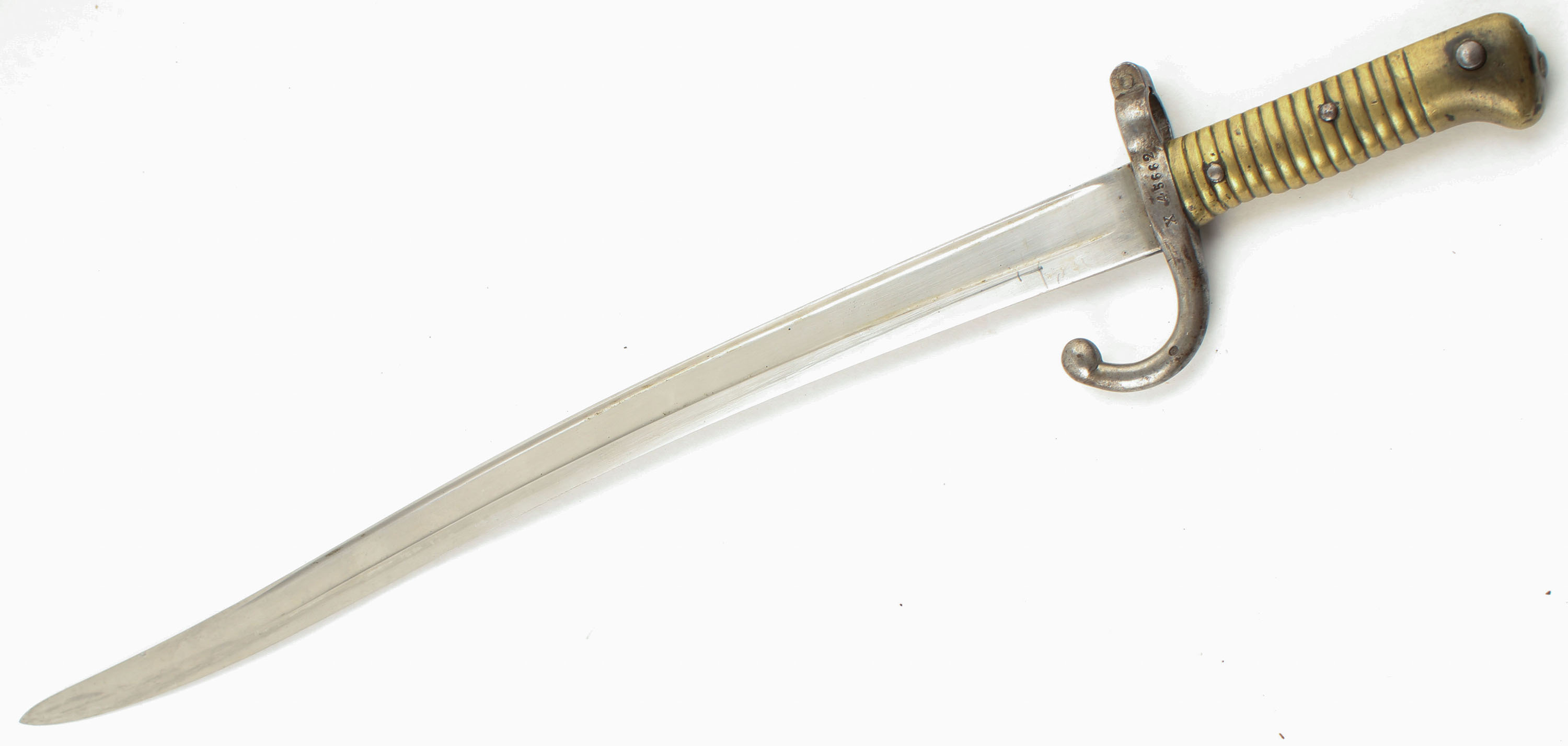 CONDITION: The straight wrist walnut stock is very good with various nicks, dings, dents & scratches from use that have been smoothed over from handling over time. The stock is a replacement with the incorrect S/N (C 67181) in the left cheek. The right cheek of the stock has the French roundel acceptance cartouche with a box wood plug in the middle, it reads ''JUILLET F.C.1872 P'' with a ''M'' in the middle on the plug. There is a multitude of French cartouches on the belly, cheeks, & wrist of the stock. The metal has toned to a even mix of chocolate brown patina & dark patina with some gun metal gray visible around the stock line. The metal appears to have been refinished at a arsenal, the French receiver markings are thinned with even light roughness across it, the British proof is strong in contrast as well as all the markings on the barrel not looking buffed. The receiver band is marked with a British (Birmingham) & French proof. The right rear section of the receiver has a ''8'', ''7'' & another small faded marking. The left side of the receiver is marked ''MANUFACTURE IMPERIALE'' (pre Sep-1870 MFG) over ''ST ETIENNE'' (in French script), & ''MLE 1866''. The left chamber flats are marked with Commercial British proofs (Birmingham) with the bore measurement ''60'' the S/N, ''P*G'', ''B'' in circle, & ''D'' in circle. The top chamber flat is marked ''R'' under a ''C'' in oval proof, & four more small French proofs. The right chamber flats are marked ''S.1870'' (St. Etienne MFG 1870) &next to a small shield proof, ''MI'' (pre Sep 1870 MFG), & more French proofs. The buttplate is marked ''93'' & on the upper extension is two ore French proofs. The trigger guard & barrel bands have French proofs, the front band is marked ''R'' in circle. S/N matching bayonet lug. S/N mismatched bolt (FG 13320) all bolt parts match each other. The rubber obturator is dry & hardened, needle is intact & sticks out about 1/4'' from the bolt face in the fired position (DO NOT DRY FIRE, CAN DAMAGE NEEDLE & BREECH). The bore is very good. Its bright & shiny with strong rifling, but has some roughness in the grooves. The barrel holds a small barleycorn front sight with a stepped base/ladder wide V-notch rear sight & the updated added on ladder. Marked 2 to 4 on the base, 5 to 12 on the ladder. The stock carries a steel buttplate, toned brown with some light roughness. The rifle has both factory sling loops & the cleaning/clearing rod. The rifle comes with the correct Yatagan Sword bayonet, has a brass handle, minimal patina specking on blade, no chips in the edge, & is S/N mismatched to the rifle (X 45662). Mechanical function appears solid. Antique, No FFL Req. - Value: 500 to 1500