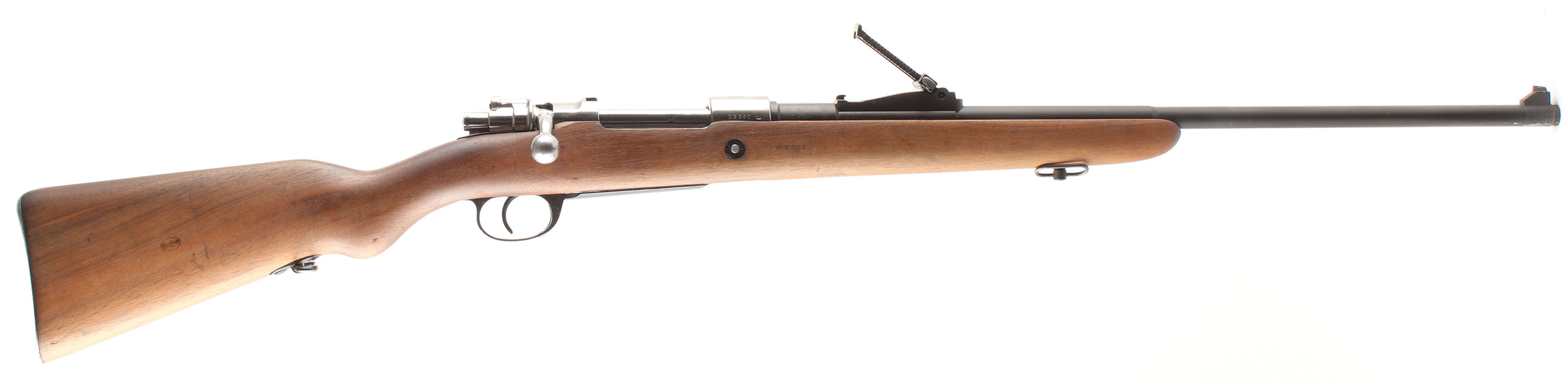 CONDITION: The cut down & shaped, semi-pistol grip walnut stock is excellent with only a couple superficial nicks, dings, & scratches. stock was lightly sanded & oiled when it was cut down leading to the military cartouches being thin. Wood plug in the cleaning rod channel where it was cut down. The right cheek of the stock is marked with a Argentina coat of arms roundel stamp. There is one faint crest cartouche on the bottom of the wrist & three more faint stamps in the belly of the stock. The right flat of the stock just in front of the recoil lug is stamped with a mismatched S/N ''C2251''. The barrel carries a old arsenal re-blue with some spots of roughness under the blue. The barrel's finish rates 90% with some scuffs/scratches. The receiver was left in the white (unfinished) from the factory, it has been buffed clean at some point with a couple small spots of roughness & thinned markings especially the crest. The left side of the receiver is marked ''DEUTSCHE WAFFEN-UND'', ''MUNITIONSABRIKEN. BERLIN''. The left side of the receiver band is marked ''MAUSER MODELO'', ''ARGENTINO 1909'', the top is marked with the marked with the Argentina coat of arms, the right side is marked with the S/N. The left side of the chamber was double stamped ''CAL 30-06''. The right side of the chamber is marked with the S/N & the top is marked with a proof. S/N matching bolt, barrel, & trigger guard/magazine assembly. The bore is good to very good. its bright with solid rifling but has continuous roughness throughout the bore. The barrel holds a barleycorn front sight with a tangent V-notch rear marked 3 to 20. The stock carries a steel buttplate left in the white, has rust speckling. The rifle has the factory rear sling loop & an aftermarket front swivel. Mechanical function appears solid. FFL or C&R Req. - Value: 200 to 400