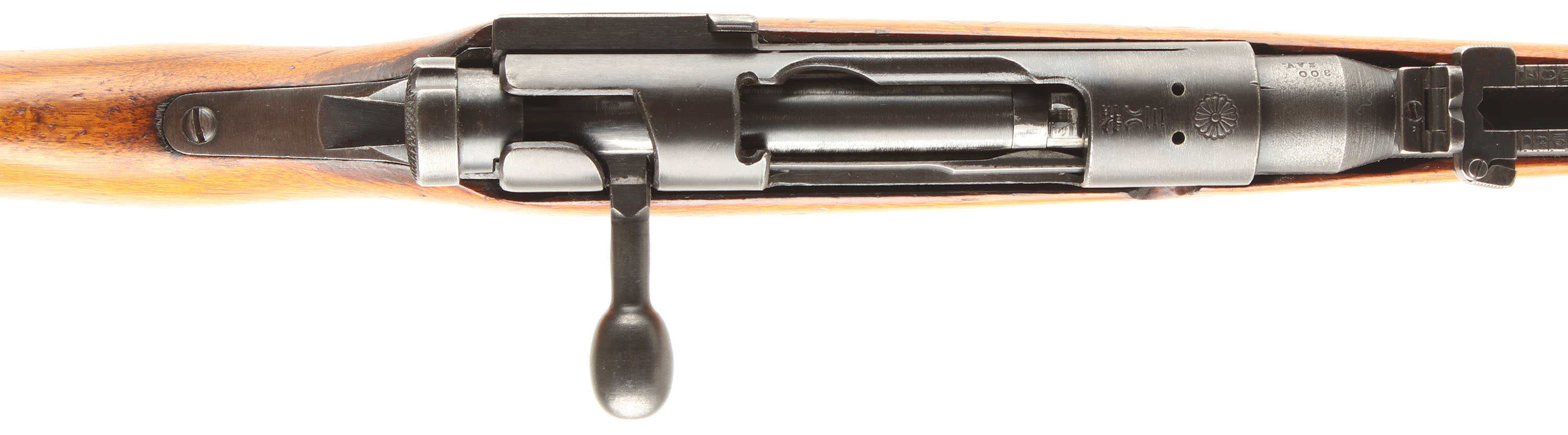 CONDITION: The semi-pistol grip Japanese Walnut (Oni-gurumi or Siebold walnut) stock is very good as being cut down, shaped, lightly sanded & refinished. There are still present deeper dings/gouges from after the refinish, as well as some newer nicks, dings, & scuffs from after. Two-piece Japanese buttstock. Inside of the rear sling cutout is marked ''W''. The metal carries a old thin re-blue that retains almost full coverage but is toning to a mix of gray & brown patina with speckled rust & spots of roughness from cleaned pitting present on the barrel. Some spots of deeper blue are still present at the rear of the receiver. The receiver band is marked with a INTACT chrysanthemum (Most were ground off when surrendered rifles as a face-saving gesture), over ''TYPE 38'' in Japanese. The left side of the receiver is marked with the series mark, the S/N, the Nagoya arsenal logo, & Japanese inspectors marks. The left side of the chamber is stamped ''300'' over ''SAV.'' (the barrel was shortened at the chamber end as part of the re-chamber to 300 Savage). The barrel appears to be a later type 99 barrel that was fitted to a type 38 Rec. with a late production 99 style front sight but with the older type 38 rear sight. The barrel is the same length as a factory type 99 from where the chamber tapers down to the barrel, to the muzzle. S/N matching bolt. The bore is good. It's bright & shiny with thin rifling & a couple spots of roughness. The barrel holds a barleycorn front sight & a flip up ladder, V-notch rear sight marked 4 to 24. The stock carries a blued steel cupped buttplate that's worn gray with speckles of brown patina & over applied stock lacquer on the sides. The rifle has no sling mount or a cleaning rod. Rifle does come with a rubber slip on recoil pad/LOP extender. Mechanical function appears solid. FFL or C&R Req - Value: 150 to 300