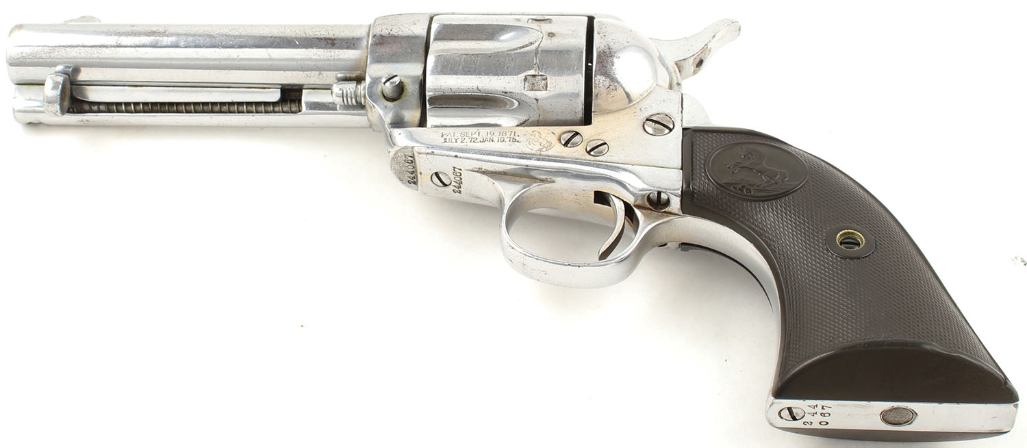 Colt, Single Action Army, CAL: 45 Colt, MFG: 1903, SN: 244067, SAO Revolver, 4 3/4'' Barrel. The checkered vulcanized rubber Colt grips with Rampant Colt logos are excellent with some wear from use. The checkering is slightly thinned with some small dings & scratches throughout. The metal holds a non-factory nickeled finish. The nickel finish on the gun is good to very good with some gun metal grey exposed. There is some light brown patina in hard to reach areas around the gun. There are substantial drag lines on the cylinder. The gun appears to have been substantially buffed in the refinish process thinning the markings. The only markings on the barrel is a non-legible & a barely visible ''45 Colt'' on the left side. The two line patent roll stamp & rampant colt logo on the left side of the frame is slightly faded but still visible & legible. The serial numbers on the frame, trigger guard, & butt of the grip match & are all visible & legible but slightly faded. Bore is fair to good, the rifling has thinned but is still pronounced & the bore is dark with even roughness throughout with substantial pitting concentrated near the center of the barrel. Mechanically solid, seems to function well. The action has all four distinct clicks that one would expect from a SAA. The clicks in the action are very tactile & audible, the action feels tight. A fixed front sight is integral to the barrel, a rear sight notch is cut into the frame. FFL or C&R Req. - Value: 1000 to 3000