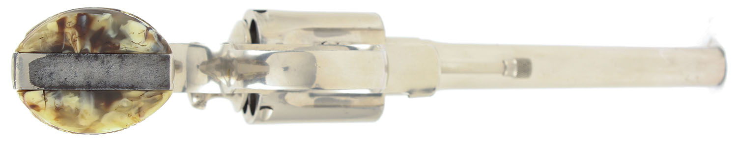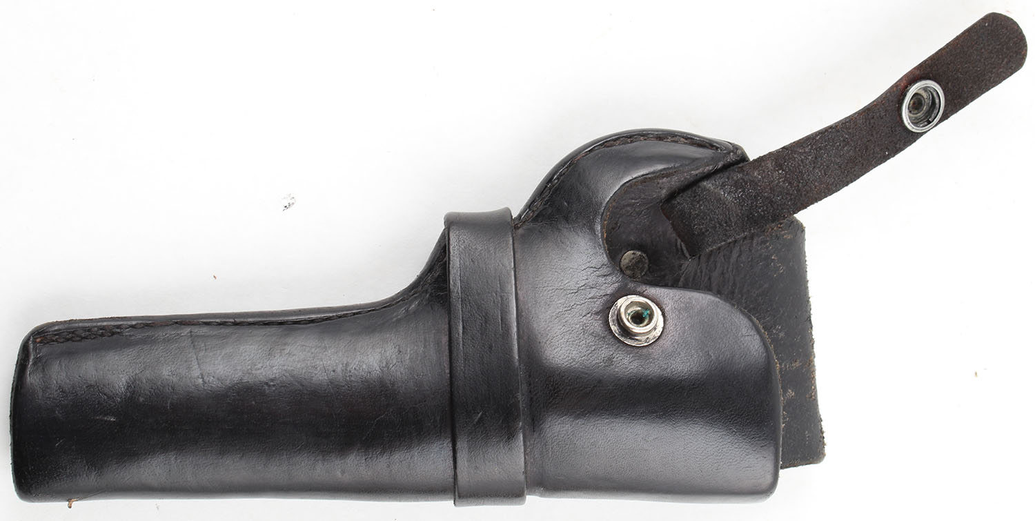 Colt, Police Positive, CAL: 38 SPL, MFG: 1924, SN: 288290, DA/SA Revolver, 5'' Barrel. The checkered plastic multicolor grips are excellent with minimal wear. The metal holds a nickeled finish. The nickeled finish is very good to excellent. The gun has near total coverage with some exposed gun metal grey concentrated near the muzzle & on the backstrap & butt of the grip. The factory markings are slightly thinned but still visible & legible. Bore is very good, near excellent, the rifling is strong & bright with very light roughness throughout. Mechanically solid, seems to function well. A fixed front sight is integral to the barrel, a rear sight notch is cut into the frame. Comes with a ''Eubanks Leather'' brand leather holster with 87PP stamped into it. FFL or C&R Req. - Value: 400 to 800