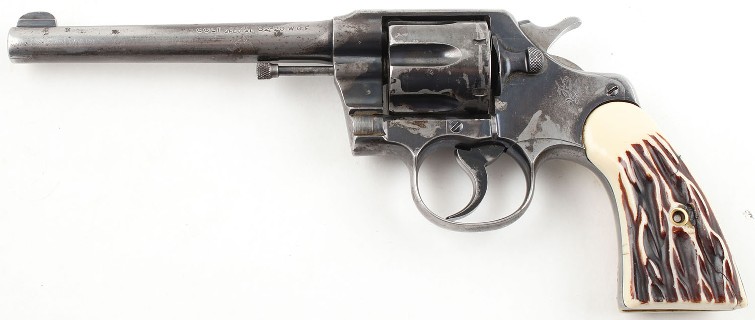Colt, Army Special, CAL: 32-20 WCF, MFG: 1924, SN: 505149, DA/SA Revolver, 6'' Barrel. The faux stag grips are fair, they have two substantial cracks. There is a large crack on the left grip panel that runs vertically down the majority of the grip. There is a horizontal crack on the bottom of the right grip that runs about half way across the grip. The metal holds the factory blue finish. The blue on the barrel rates approximately 30% the sides of the barrel being worn down to gun metal gray with speckled shallow pitting. The frame rates approximately 60% with substantial handling wear as well as what appears to be some kind of chemical erosion causing the surface of the metal to flake & peel away. The factory markings are relatively crisp & all legible. Bore is good to very good, the rifling is strong & bright with very light roughness throughout & a couple of small spots of deep pitting throughout. Mechanically solid, seems to function well. A fixed front sight is integral to the barrel, a rear sight notch is cut into the frame. FFL or C&R Req. - Value: 300 to 600