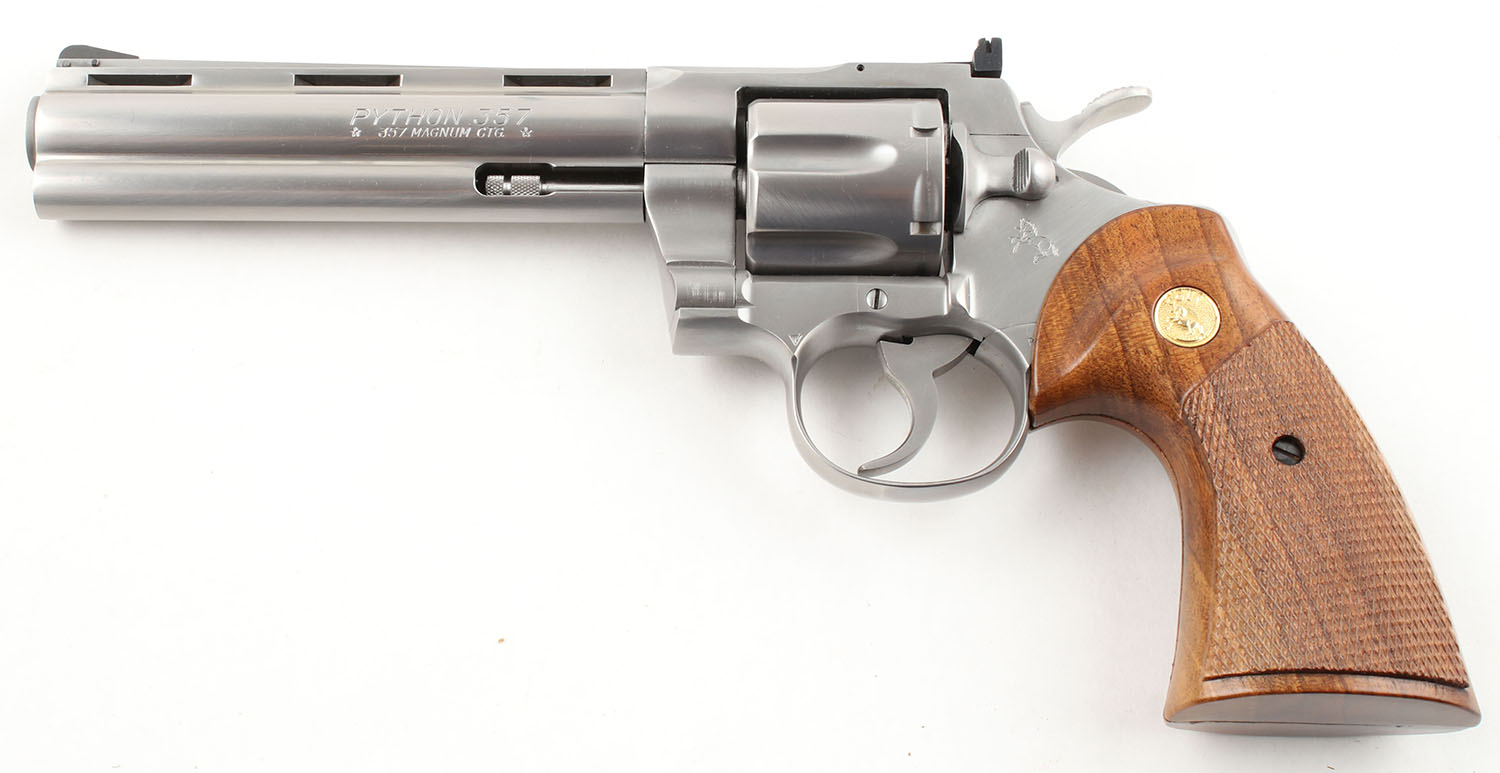 Colt, Python, CAL: 357 MAG, MFG: 1983-96, SN: K98725, DA/SA Revolver, 6'' Barrel. The factory checkered wood grips with Rampant Colt medallions are excellent with light handling wear. The matte stainless finish on the gun is excellent with minimal wear & a pronounced drag line. The factory markings are all crisp. Bore is excellent, bright with strong rifling & light even roughness near the muzzle. Mechanically very solid, seems to function well. The barrel holds a serrated ramp front sight, a windage & elevation adjustable rear sight is mounted to the frame. Comes in a generic soft pistol case. FFL Req. - Value: 1800 to 2500