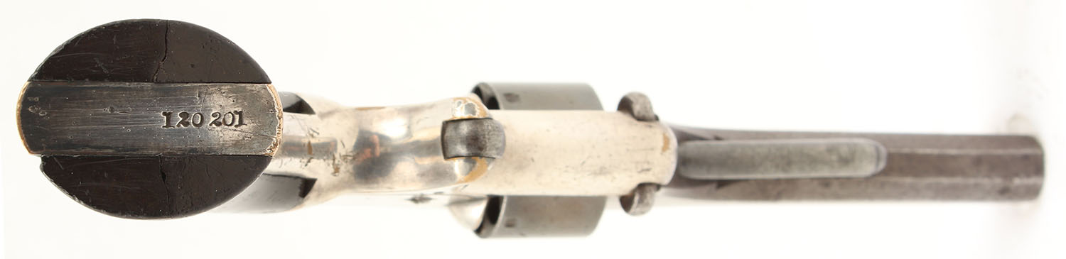 Smith & Wesson, Model Number One, 2nd Issue, CAL; 22 RF SH BP, MFG: 1860-68, SN: 120201, Single Action Tip-Up Revolver, 3 3/16''. The top of the barrel is marked ''SMITH & WESSON SPRINGFIELD MASS''. The butt is marked with the full SN. The inside of the right grip has a full matching Sn stamped into it. The original two-piece rosewood grips are good & solid. There is a small grain crack in both grips, starting at the bottom, working up next to the screw hole & a small edge chip on the bottom left corner. The original finish has some scrapes, dings & areas of flaking finish. The metal blue finish on the barrel has fully worn to metal gray, with spotting toned to a brown patina. The original nickel finish on the brass frame rates 85-90%, with corners & edges worn to brass. Bore is fair, with roughness & intermittent pitting. Small blade front sight & small notch rear sight. Appx 117,000 produced. An all original, SN matching, excellent example of a Number One, 2nd Issue. Antique, No FFL Req. - Value: 800 to 1500