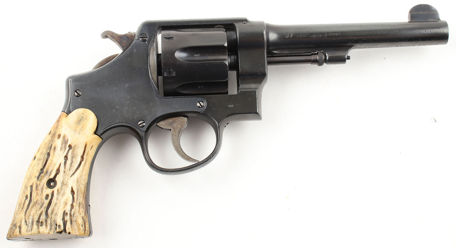 Smith & Wesson, US Army Model 1917, CAL: 45 ACP, MFG: June 1918, SN: 73220, DA/SA Revolver, 5 1/2'' Barrel. The authentic bone grips which appear to be shaped & cut to look like stag are very good, near excellent with some age soiling & discoloration. The metal holds a re-blued finish, maybe an arsenal refinish, that covers up speckled clean shallow pitting throughout. The finish has retained nearly full coverage & rates approximately 95%. The top of the barrel is marked with standard address & patent dates. The bottom of the barrel is marked ''UNITED STATES PROPERTY''. The left side of the barrel is marked ''S&W D.A. 45''. The left side of the frame above the trigger guard has a ''EAGLE HEAD'' over a very faint, non-legible ''S9'' proof & there's a ''FLAMING BOMB'' proof in front of the hammer. There are multiple British Commercial proof marks on the cylinder, right side of the frame & caliber marking on the right side of the barrel. The butt is marked ''U.S ARMY MODEL 1917 NO 73220''. Bore is fair, the rifling is slightly thinned & slightly darkened with light even roughness throughout. Mechanically solid, seems to function well. The barrel holds a fixed front sight, a rear sight notch is cut into the top of the frame. FFL or C&R Req. - Value: 500 to 1000