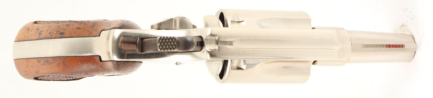 BOXED Smith & Wesson, Model 36, CAL: 38 SPL, MFG: 1982, SN: 1J07693, DA/SA Revolver, 2'' Barrel. The factory checkered wood grips with ''S&W'' medallions are excellent, solid with slightly worn checkering. The metal holds a nickeled finish. The finish is excellent with light use wear including a drag line, some wear near the muzzle & some wear on the front strap & backstrap of the grip. The case coloring on the trigger & hammer is very good, slightly faded. All of the standard markings around the gun are crisp. Bore is excellent, bright with strong rifling. Mechanically solid, seems to function well. The barrel holds a serrated fixed front ramp sight with some red paint or finger nail polish. A rear sight notch is cut into the top of the frame. Comes in a non-serially matching box that is correct to the make, model, & era with some related paperwork & wax paper. FFL Req. - Value: 400 to 600