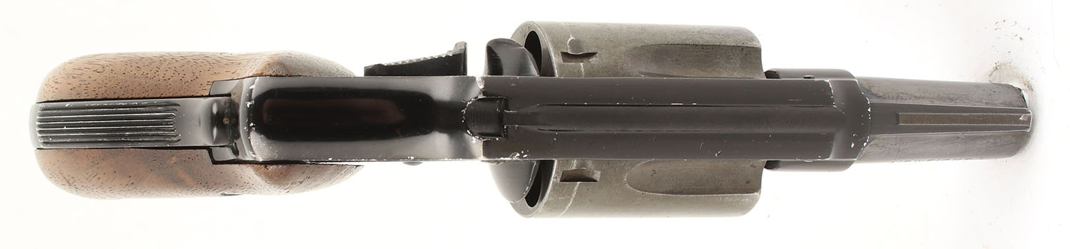 Smith & Wesson, Model 42 Airweight, CAL: 38 SPL, MFG: 1952-71, SN: 11440, DAO Revolver, 2'' Barrel. The factory smooth wood grips with ''S&W'' medallions are very good, solid with substantial wear from carry & use, the protective clear coat that was applied to the wood at the factory has worn almost entirely away. The alloy frame holds a black finish, the finish is very good with substantial edge wear. The blue on the cylinder has worn thin & begun to tone to a brown patina leaving a mix of gun metal gray, original blue, & brown patina. The blue on the barrel has some small splotches of clean shallow pitting as well as some dings on the muzzle & holster wear. All of the standard markings around the gun are crisp. Bore is very good, bright with strong rifling & a couple of small deep pits near the muzzle. Mechanically solid, seems to function well. The front sight appears to have been ground off. A rear sight notch is cut into the top of the frame. FFL or C&R Req. - Value: 200 to 400