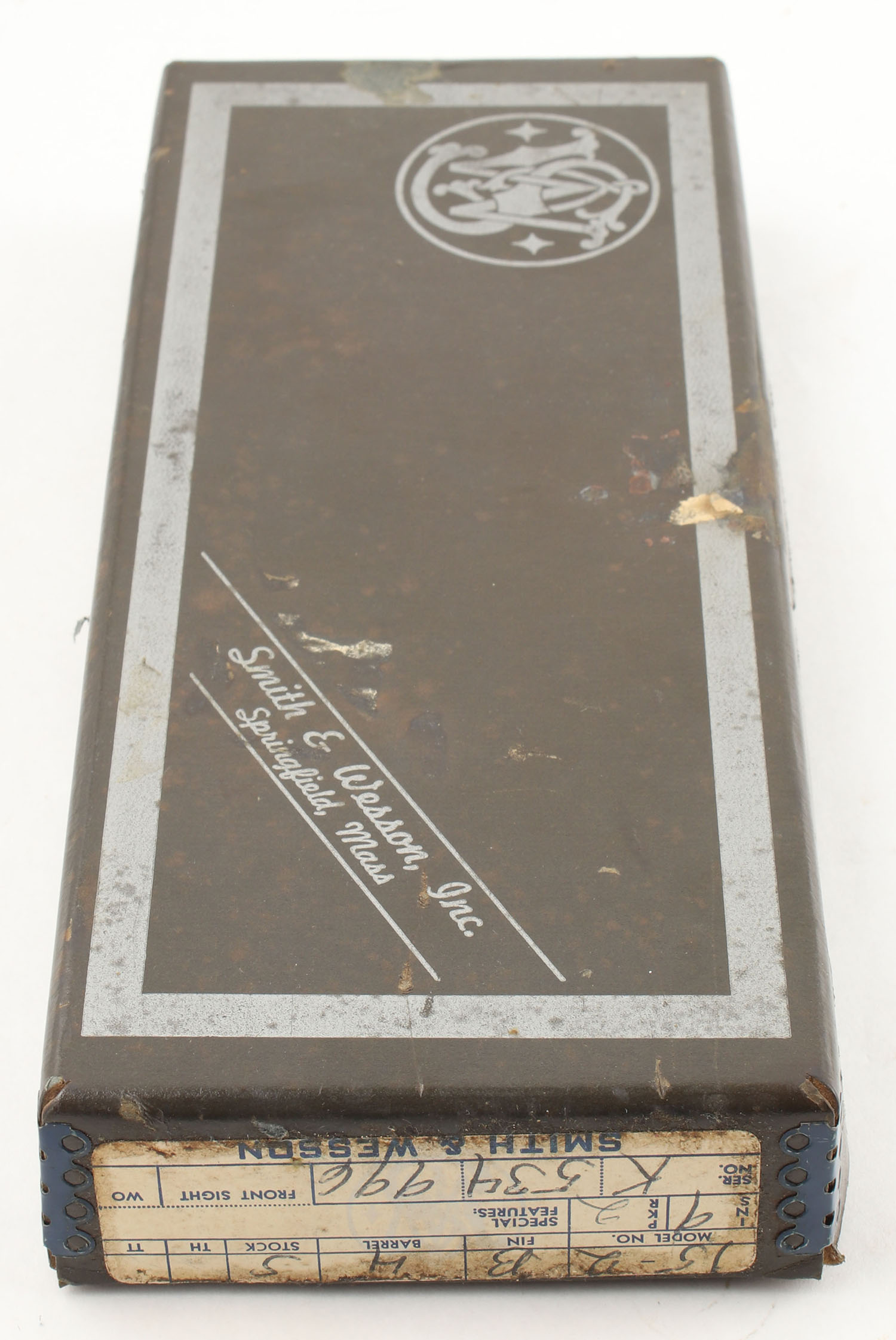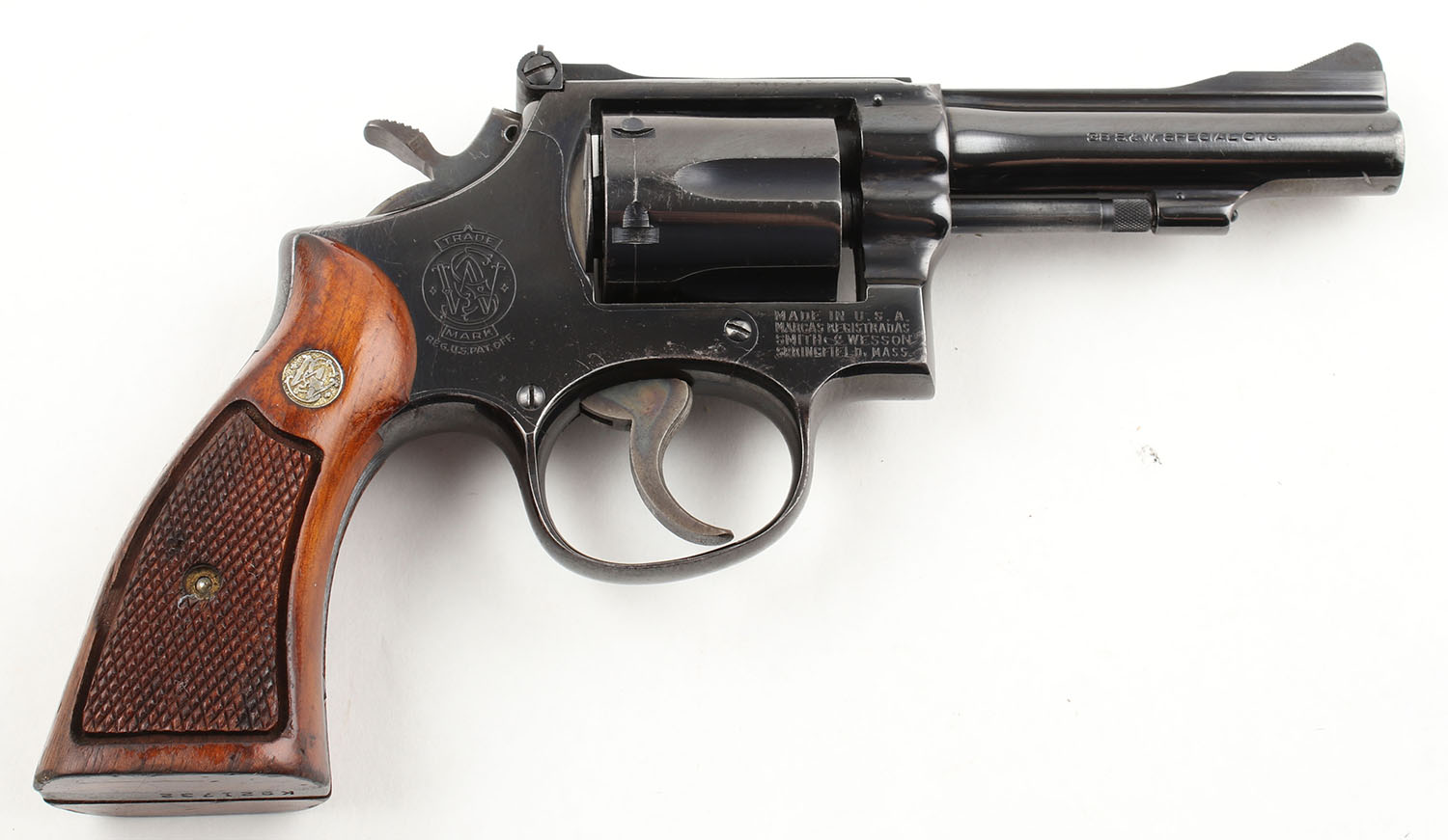 Smith & Wesson, Model 15-3 ''Combat Masterpiece'', CAL: 38 SPL, MFG: 1969, SN: K921732, DA/SA Revolver, 4'' Barrel. The factory checkered wood grips with ''S&W'' Medallions are very good with some edge chipping around the checkering & age soiling. The factory blued finish rates approximately 85% with some surface scratches, edge wear, & wear from use. There is a gun metal gray drag line. The barrel near the muzzle has thinned from holster wear exposing gun metal grey. There is some patina in the serrations of the front strap backstrap. All of the standard markings around the gun are visible & legible. Bore is excellent, bright with strong rifling. Mechanically solid, seems to function well. The barrel holds a serrated fixed front ramp sight. A windage & elevation adjustable rear sight is mounted to the top of the frame. Comes in a Smith & Wesson box with wax paper, a dry fire target, & an owners manual. FFL or C&R Req. - Value: 500 to 800