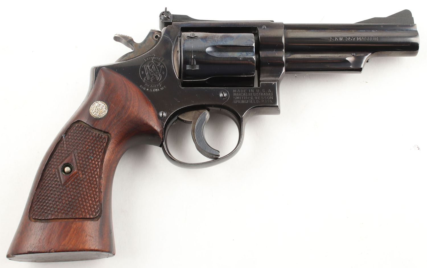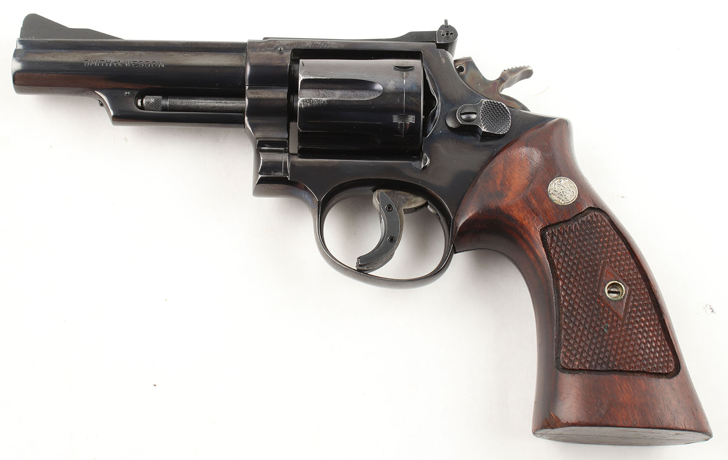 Smith & Wesson, Model 19-2, CAL: 357 MAG, MFG: 1965, SN: K650490, DA/SA Revolver, 4'' Barrel. The factory checkered wood grips with ''S&W'' Medallions are very good to excellent with a couple of edge chips on the bottom of the left grip panel & consistent surface scratches & dings throughout. The factory blued finish rates approximately 96% light use wear including a drag line & holster wear on the muzzle. There are a couple of small surface scratches on the gun as well as some edge wear & small scuffs. All of the standard markings around the gun are crisp. Bore is very good, near excellent, bright with strong rifling & light roughness concentrated near the muzzle. Mechanically solid, seems to function well. The barrel holds a serrated fixed front ramp sight. A windage & elevation adjustable rear sight with a white square ''U'' notch is mounted to the top of the frame. FFL or C&R Req. - Value: 600 to 1200