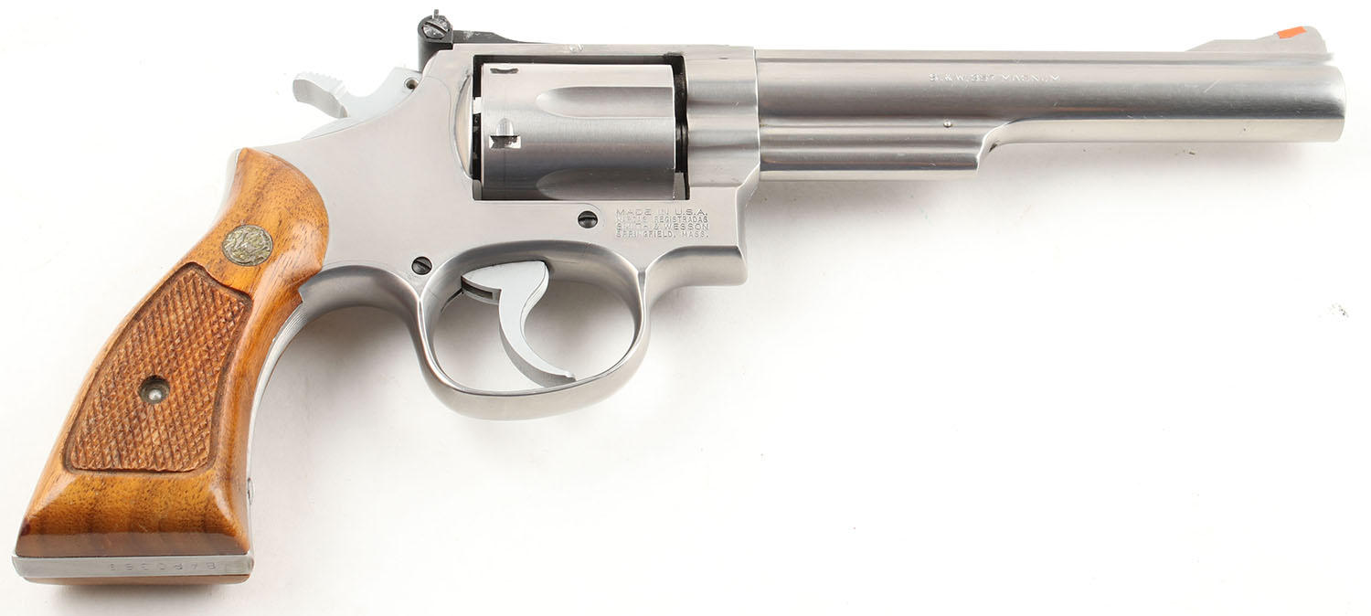 Smith & Wesson, Model 66-2, CAL: 357 MAG, MFG: 1970-2004, SN: BAR0369, DA/SA Revolver, 5 7/8'' Barrel. The factory checkered wood grips with ''S&W'' medallions are excellent with light wear & a couple of small dings. The matte stainless finish on the gun is excellent with some wear from use. All of the standard markings around the gun are crisp. Bore is excellent, bright with strong rifling. Mechanically solid, seems to function well. The barrel holds a fixed front sight with a red plastic insert. A windage & elevation adjustable rear sight is mounted to the top of the frame. FFL Req. - Value: 600 to 900