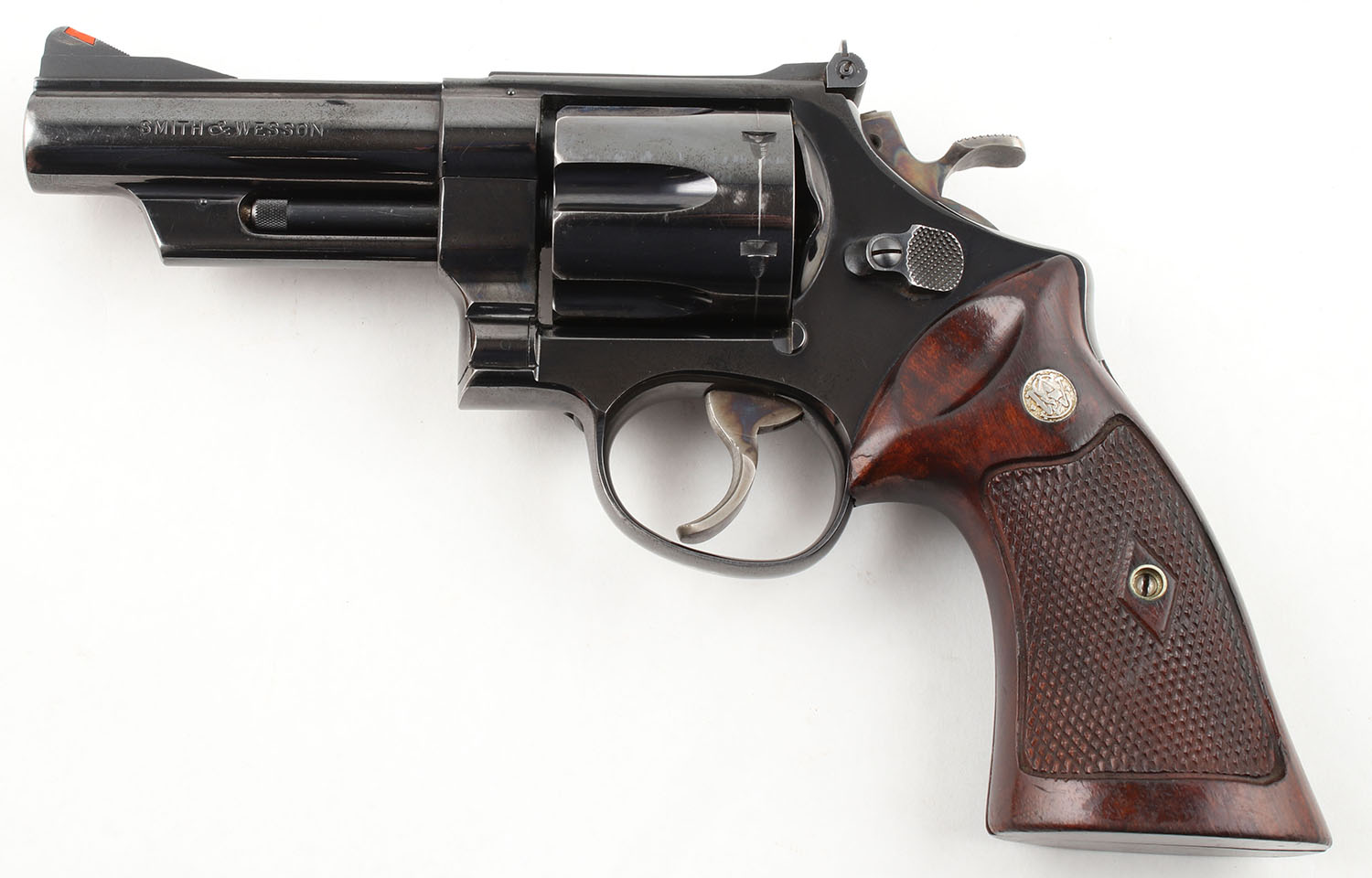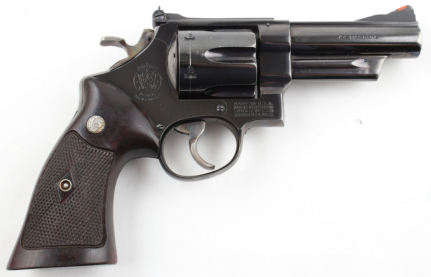 Smith & Wesson, Model 29, CAL: 44 MAG, MFG: 1959-60, SN: S196592, DA/SA Revolver, 4'' Barrel. The factory checkered wood grips with ''S&W'' medallions are very good, near excellent, with some handling wear & small dings & surface scratches throughout. There are also some very small edge chips throughout. The original blue rates approximately 90% with light wear. The cylinder has a clear drag line, the muzzle has some holster wear, & the backstrap has some thinning. There is a clear consistent scratch pattern throughout. All of the standard markings around the gun are crisp. Bore is excellent, bright with strong rifling. Mechanically solid, seems to function well. The barrel holds a fixed front sight with a red plastic insert. A windage & elevation adjustable rear sight is mounted to the top of the frame. Comes with a custom wood display case. The case is lined with blue fabric under which is formed plastic that fits the gun nicely & has a slot for a cleaning rod. A cleaning rod is present with a brush, there is a wood lid for the cleaning rod section which seems to be well made and holds a ''S&W'' medallion. The gun also comes with Smith & Wesson wax paper & a specifications sheet. FFL or C&R Req - Value: 800 to 1600