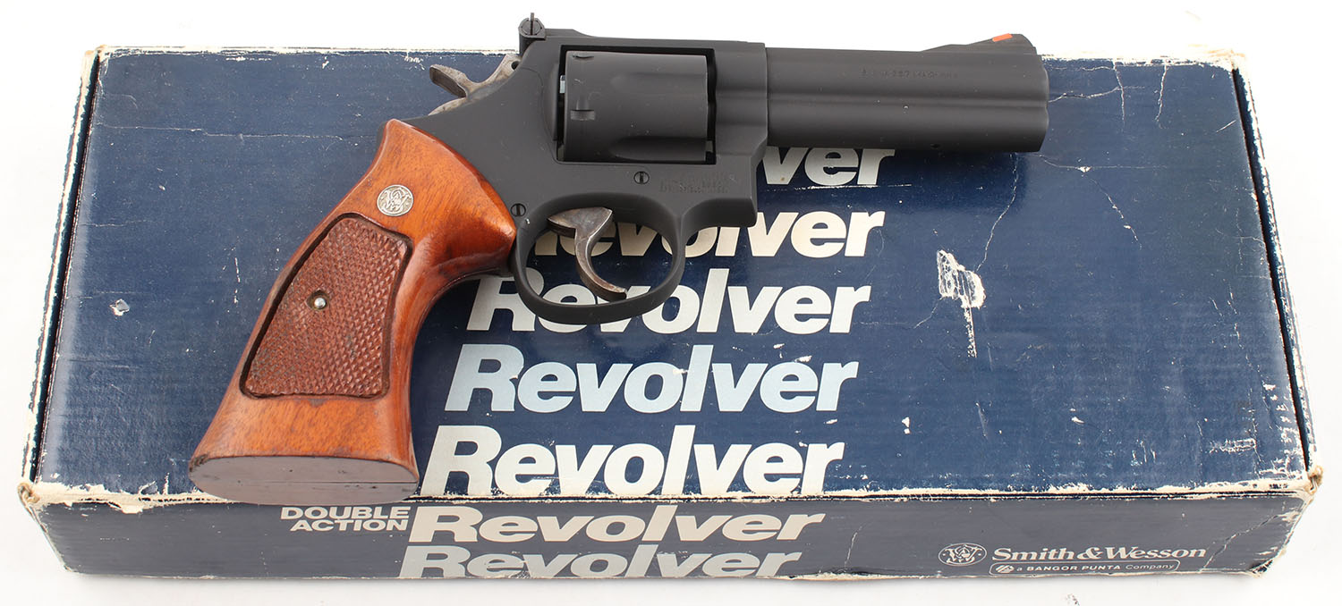 Smith & Wesson, Model 586-1 ''Distinguished Combat Magnum'', CAL: 357 MAG, MFG: 1986-99, SN: AUV6804, DA/SA Revolver, 4'' Barrel. The factory checkered wood grips with ''S&W'' medallions are very good, near excellent, with some handling wear & small dings & surface scratches throughout. There are also a couple of edge chips throughout & a splintered section near the edge of the checkering. The metal carries what appears to be a non-factory professionally applied parkerized finish. The finish is excellent with a drag line & light use wear. All of the standard markings around the gun are slightly faded from the Parkerizing process but still visible & legible. Bore is excellent, bright with strong rifling. Mechanically solid, seems to function well. The barrel holds a fixed front sight with a red plastic insert. A windage & elevation adjustable rear sight with a white square ''U'' notch is mounted to the top of the frame. Comes with a Smith & Wesson factory cardboard box for a 586 with a non matching serial number & other packing material. FFL or C&R Req - Value: 500 to 1000