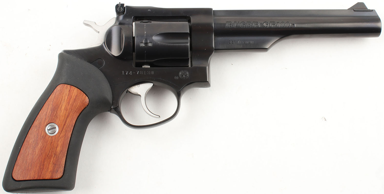 CASED Ruger, GP100, CAL: 357 MAG, MFG: 2003, SN: 174-78130, DA/SA Revolver, 6'' Barrel. The factory rubber grips with wood inserts are excellent with minimal wear. The factory blued finish on the gun rates approximately 99% with light use wear. All of the standard markings around the gun are crisp. Bore is excellent, bright with strong rifling. Mechanically solid, seems to function well. The barrel holds a fixed front sight. A windage & elevation adjustable rear sight is mounted to the top of the frame. Comes in the serially matched factory hard plastic case with a lock, cartridge casings from factory test firing, & an owners manual. FFL Req. - Value: 400 to 600
