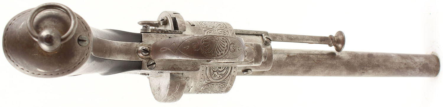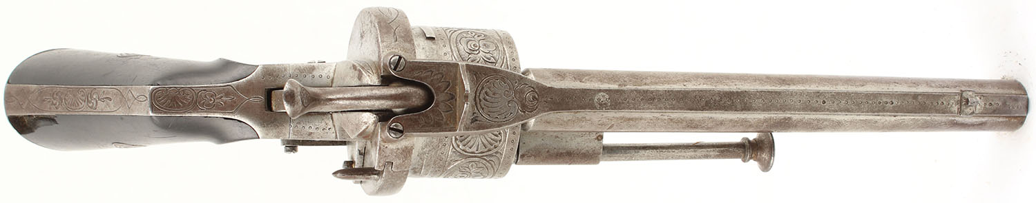 Belgian LeFaucheux Civil War Era Revolver, CAL: 12mm PinFire, MFG: 1858-73, SN: 700, Double Action Revolver, 6 1/8'' barrel. The cylinder is marked with Leige ''ELG in Crown'' proof & ''Crown/N''. The SN can be seen on the right side of the frame. The revolver is tastefully hand engraved with ornamental & punch dot work. The original Ebony grips are very good & solid. The bottom rear corner of the right grip has an edge chip. The original blued finish has mostly worn to metal gray & toned to a thin brown patina, with remnants in heavily protected areas. Bore is good & bright, with intermittent pitting & roughness. Fixed rear sight & small beaded blade front sight. Lanyard loop. A nice example of a Belgian LeFaucheux revolver. Antique, No FFL Req. - Value: 1000 to 3000