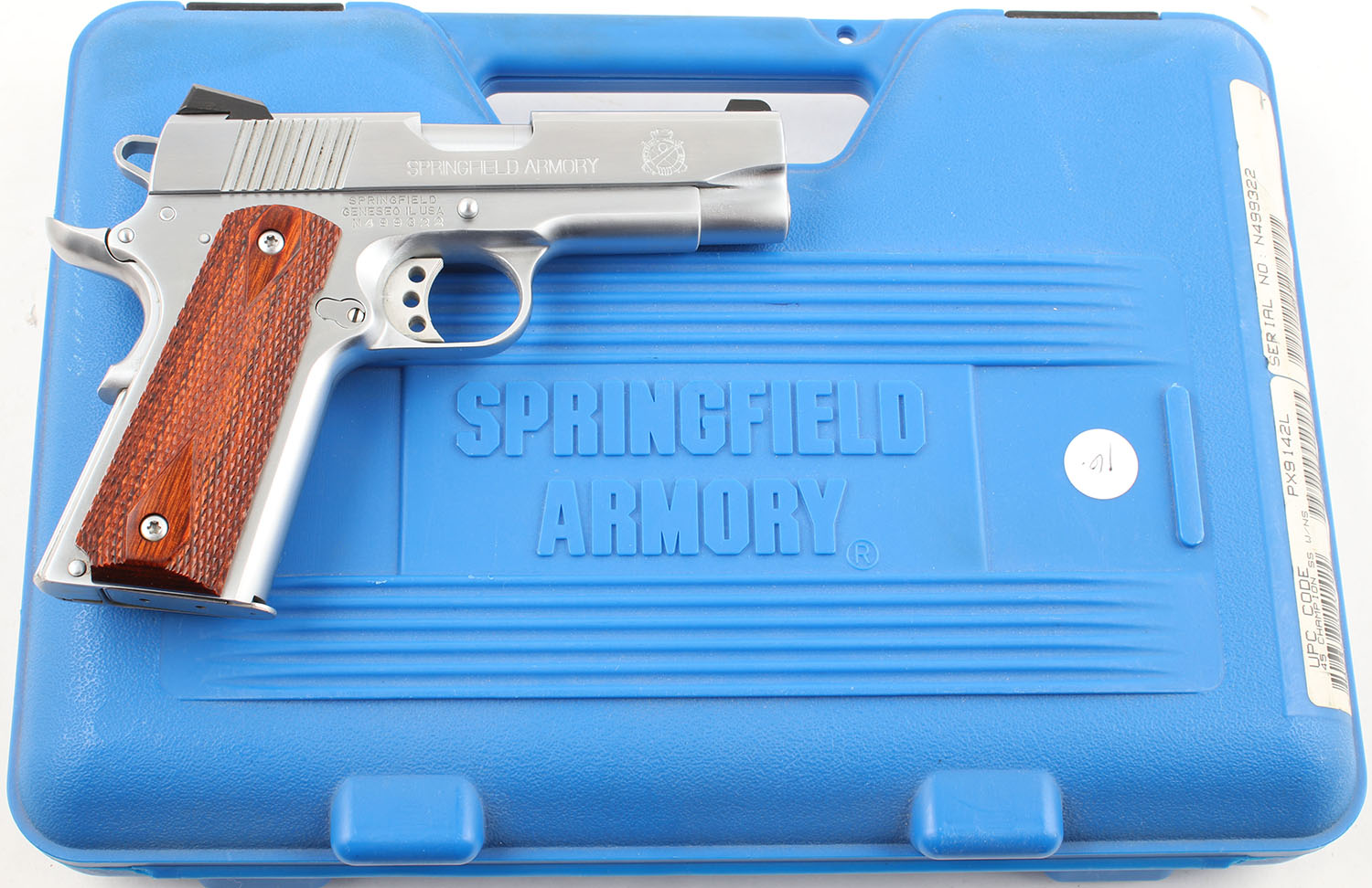 Springfield Armory (IMBEL Brazil), Champion (Commander 1911), CAL: 45 ACP, MFG: Modern, SN: NM626290, Single Action Semi Auto Pistol, 3 7/8'' Barrel. The factory checkered wood grips are excellent with little to no wear. The stainless steel finish on the gun is excellent with minimal handling wear. Bore is excellent, bright with strong rifling. Mechanically solid, seems to function well. The parts fitment is good, the slide and frame have some play. The slide has slightly more play than one would expect from a Springfield 1911. The gun has fixed 3 dot white sights, both of which are set in dovetail cuts on the slide. The gun comes in the serially matched factory case with two Kimber magazines, an owners manual, and other related paperwork. FFL Req. - Value: 500 to 1000