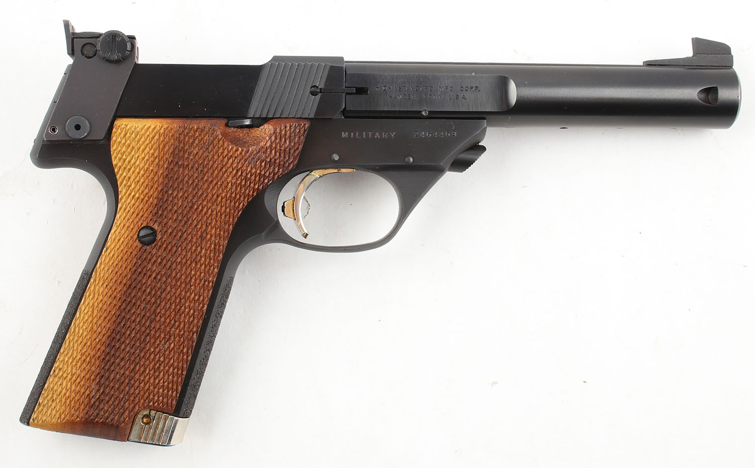 High Standard, ''Military Supermatic Trophy'', CAL: 22 LR, MFG: 1973, SN: 2464469, Semi Auto Pistol, 5 1/2'' Barrel. The checkered wood grips with thumb rest are excellent, solid with minimal wear. The blued finish rates approximately 98% with a couple of small surface scratches. Bore is very good, near excellent, bright with slightly thinned rifling. Mechanically solid, seems to function well. A fixed black front sight is screwed to the barrel, a black windage & elevation adjustable rear sight is bolted to the frame. No magazine. FFL or C&R Req. - Value: 500 to 1000