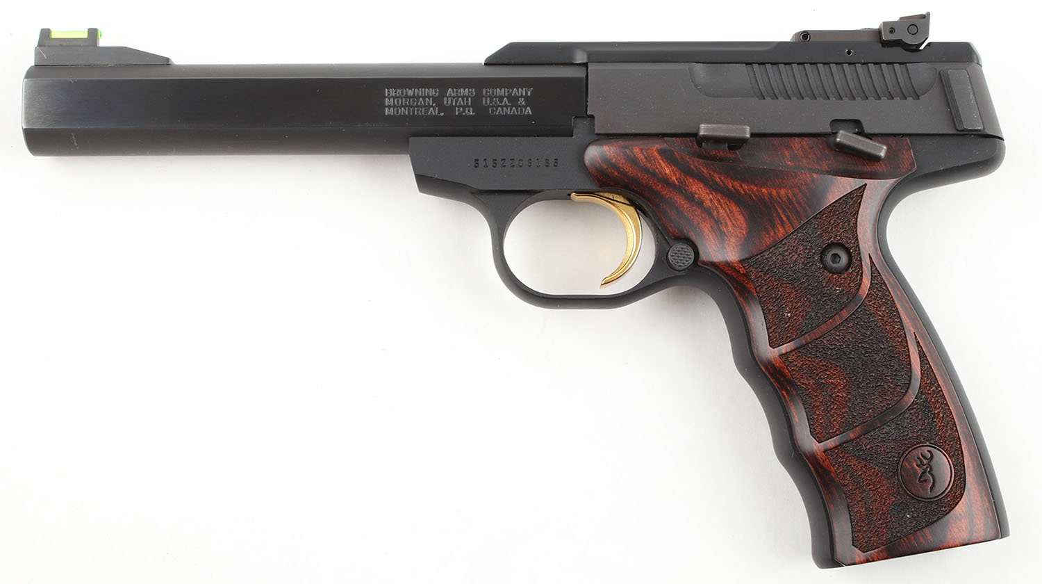Browning (USA), Buckmark Plus UDX, CAL: 22LR, MFG: Modern, SN: 515ZZ06185, Semi Auto Pistol, 5 1/2'' Barrel. The factory textured wood grips are excellent with minimal wear. The black finish on the gun is excellent with minimal wear, there are some surface scratches on the bottom of the barrel. Bore is excellent, bright with strong rifling. Mechanically solid, seems to function well. The barrel holds a front fiberoptic sight. A top strap holding a serrated all black windage & elevation adjustable rear sight is bolted to the top of the frame & barrel. Comes with one magazine. FFL Req. - Value: 300 to 600