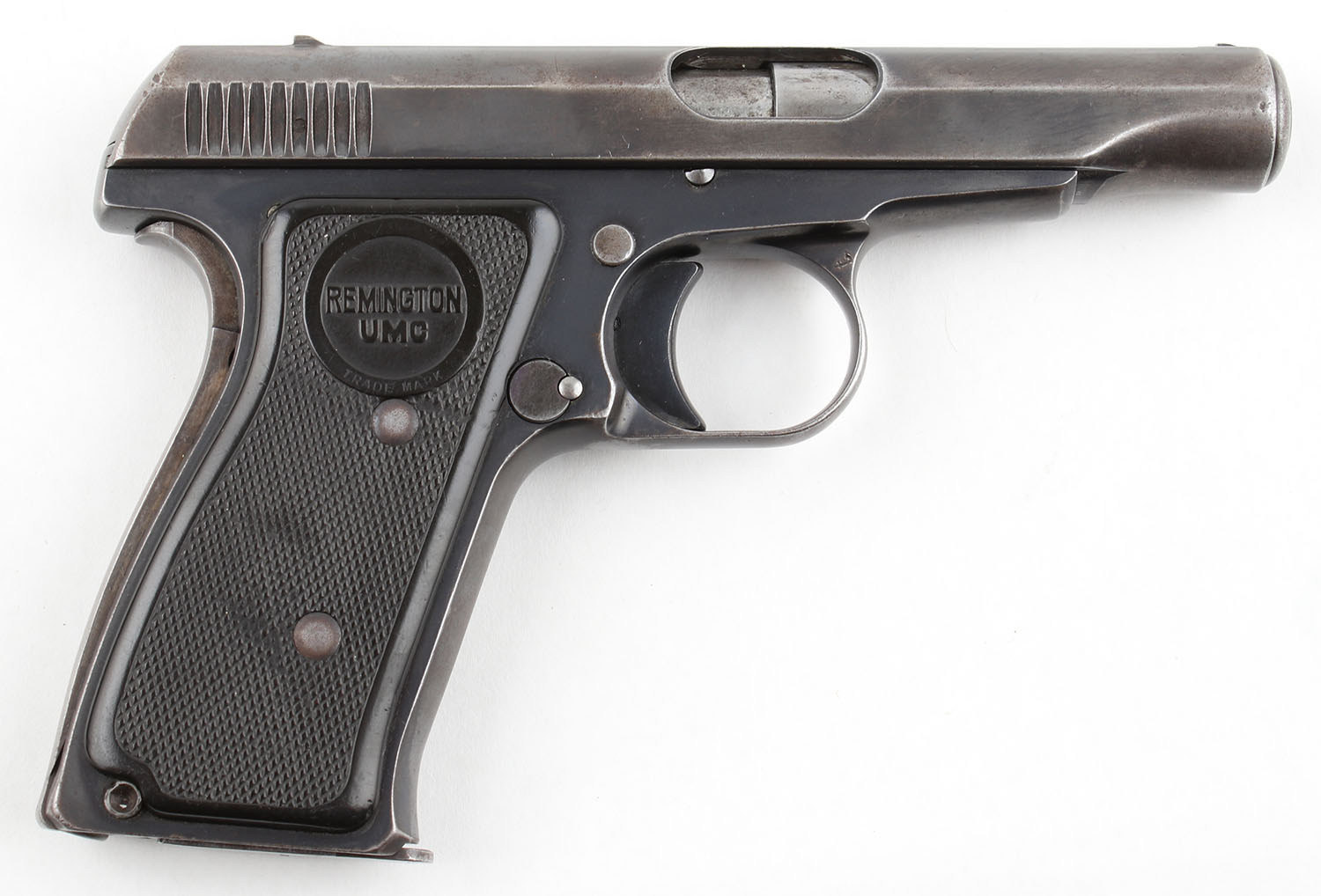 Remington, Model 51, CAL: 380 ACP, MFG: 1919, SN: PA525, Semi Auto Pistol, 3 1/4'' Barrel. The factory checkered plastic grips are very good, near excellent, solid with some small surface scratches throughout as well as some worn checkering from handling. Approximately 20% of the original blue on the gun remains intact in protected areas with the rest of the blue being substantially thinned or toned to a brown patina. Bore is good, it has darkened with rifling that is thin but still pronounced. The bore has even roughness throughout. Mechanically solid, seems to function well. Rudimentary all black sights are integral to the slide, The top of the slide is serrated to reduce glare. Comes with a generic hard plastic case & a magazine. FFL or C&R Req. - Value: 400 to 800