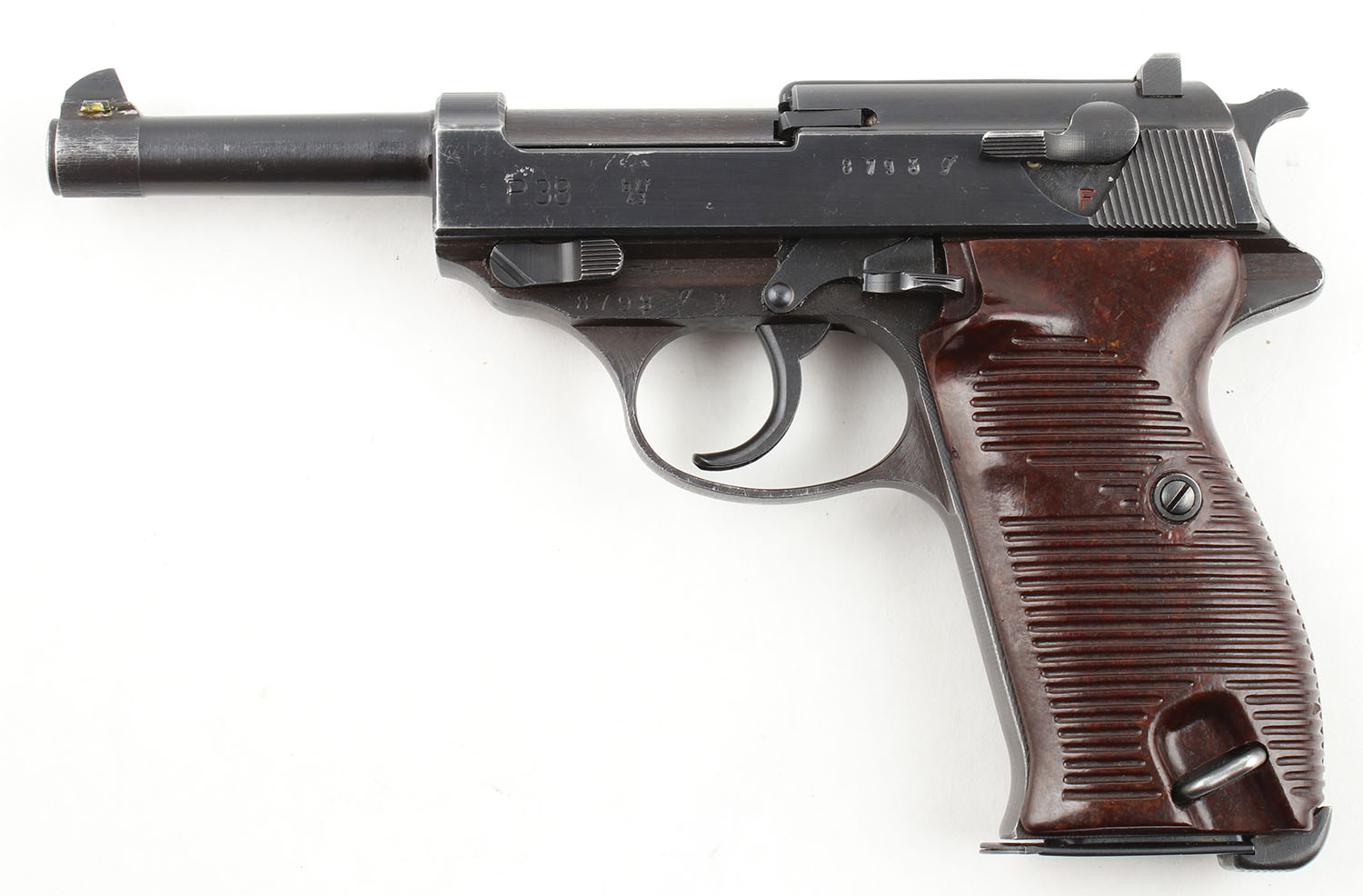 Mauser, P38, CAL: 9mm, MFG: 1943, SN: 8793, DA/SA Semi Auto Pistol, 5'' Barrel. The bakelite grips are excellent with some handling wear. The metal holds what appears to be an arsenal re-blued finish. The blue on the gun rates approximately 97%. The finish has light handling wear & edge wear. There are some small dings & scratches throughout. The right side of the slide has two German Army Waffenamts with an Iron Eagle between them, these marks are worn very thin. The rest of the markings are also thin but far more clear & legible, this is likely from being buffed during the arsenal re-blue. The serial numbers on the frame, slide, & front flat of the barrel match. Bore is very good, bright with strong rifling but substantial pitting in the groves of the rifling next to the lands. Mechanically solid, seems to function well. A fixed all black front sight is set in a dovetail cut on the barrel, a fixed all black rear sight is set in dovetail cut on the slide. Comes with an 8 round magazine. FFL or C&R Req. - Value: 700 to 1400