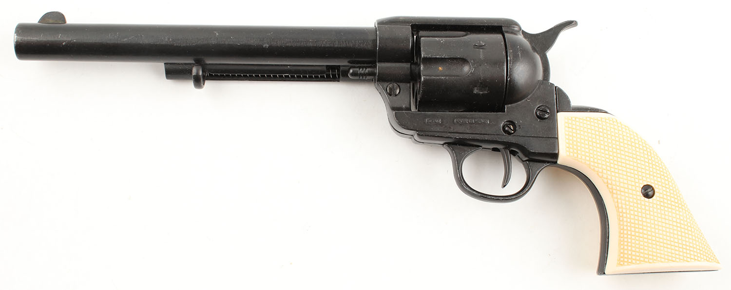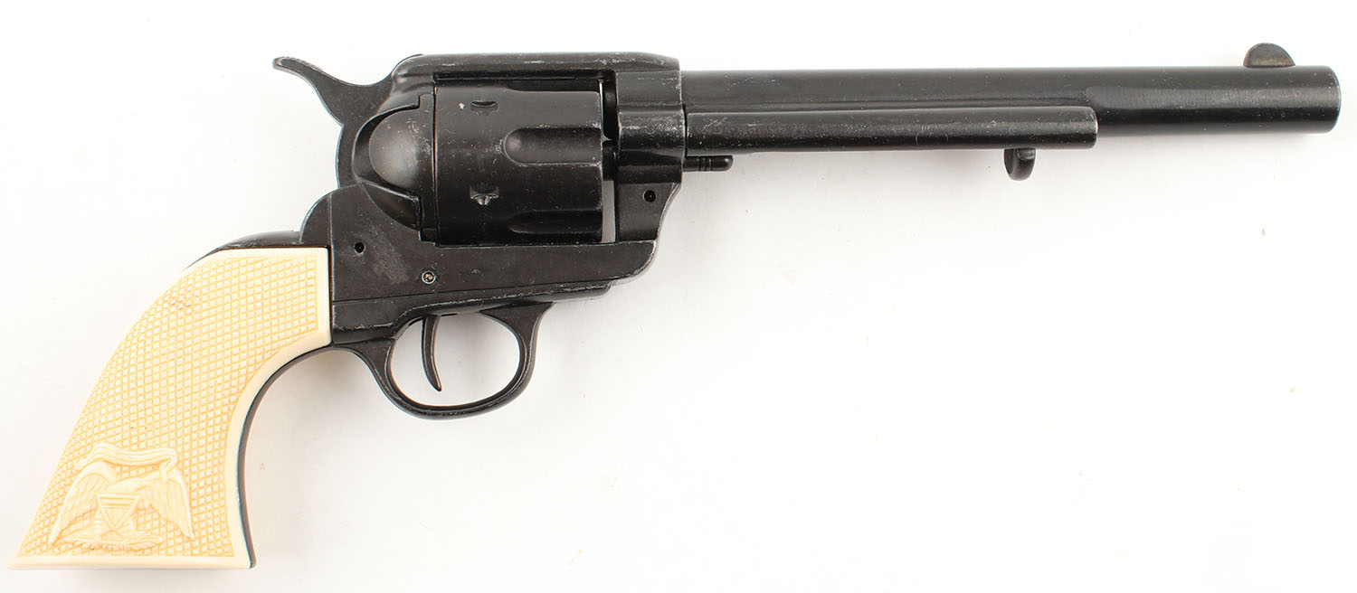 Denix Replica Colt Single Action revolver. 7.5'' barrel. Black metal finished, E. Pluribus Unum eagle repro ivory grips. Excellent non-firing reproduction. No FFL req. - Value: 50 to 200