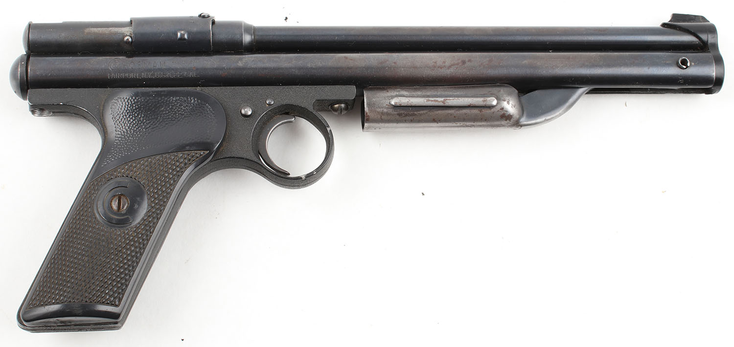 Crosman, Model 130, CAL: .22 cal. pellet, MFG: 1955-1970, SN: NA, Under lever pump pneumatic, 8.5'' Barrel. This is the second variant, with the formed metal pump handle. The checkered ''C'' logo plastic pistol grips are excellent. The metal blue finish rates 70%. Blade front sight, but missing the rear sight. Appearance is excellent, but does not hold pressure or fire. No FFL Req. - Value: 10 to 30