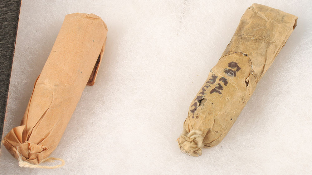 Lot of 2 Civil War era Musket Cartridges, (1) NHS, Projectile measures .60'' with paper. With folded tail and tied off at bullet end. Some tears in case. Grade Fair. (1) NHS, Projectile measures ..545'' with paper. Tan Paper with folded tail and tied off at bullet end. Grade Excellent. Both are stored in their own display case. - Value: 70 to 120