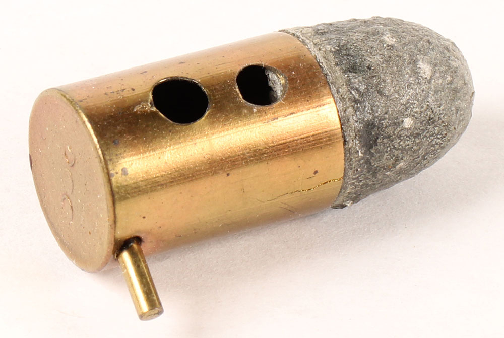 15mm Pinfire. HS:''15 FIOCCHI'', PT Lead, Brass Case. Two non-factory holes in case. Grade Very Good. - Value: 4 to 20
