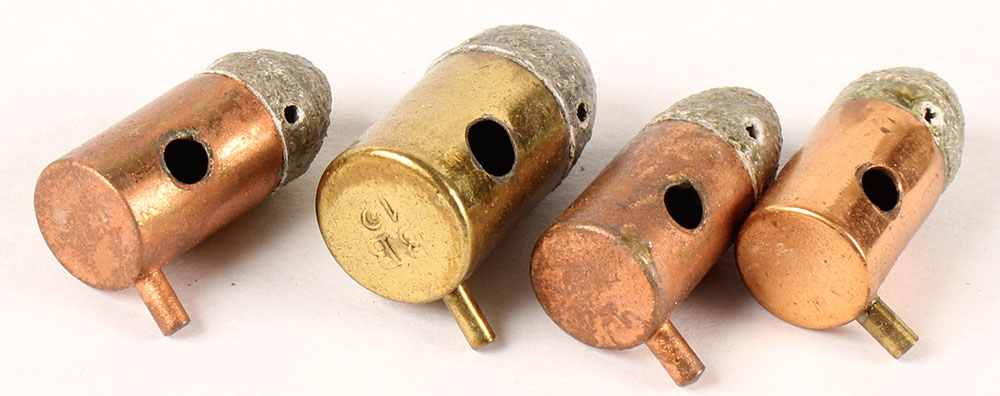 Lot of 4, Pinfire Cartridges. (3) 9mm Pinfire: 1-- HS:'' GF''PT Lead, copper case. 1-- NHS, PT Lead, copper case. 1--H S: ''GJ'', PT Lead, copper case. (1) 12mm Pinfire, HS:''BB 12'', PT Lead, brass case. All have one non-factory hole in case. Grade Very Good. - Value: 4 to 20