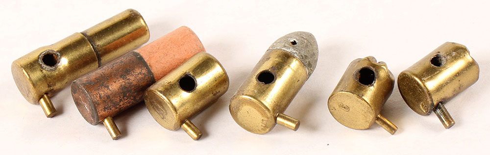 Lot of 6, 9mm Pinfires. (1) HS:''GJ'', FLARE, Brass Case and tube. (1) HS:''9'', SHOT LOAD with red tube and copper case. (1) HS:''GJ'', BALL with PT Lead and brass case. (2) HS:''9'' one raised and the other impressed, BLANKS. (1) HS:''U'' impressed, natural colored cardboard wad. All with one non-factory hole in case. Grade Very Good - Value: 8 to 24
