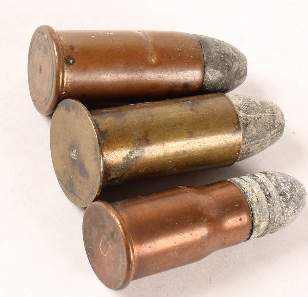 Lot of 3, Early American Cartridges. (1) 56-46 Spencer, HS:''U'' impressed. FN Lead. (1) .50 Carbine, NHS, FN Lead. (1) .50-50 Maynard, NHS, FN Lead. Grade Very Good. - Value: 30 to 50