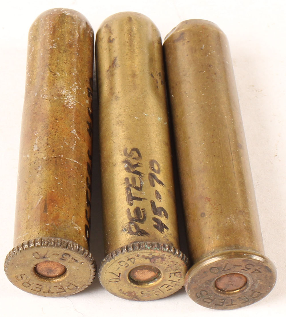 Lot of 3, 45-70 Shot Cartridges. HS:''PETERS 45-70'', 1--w/ bluish wad and ratchet rim. 1--w/ tan wad and ratchet rim. 1--w/ tan wad and NO ratchet on rim. Grade Very Good - Value: 20 to 40