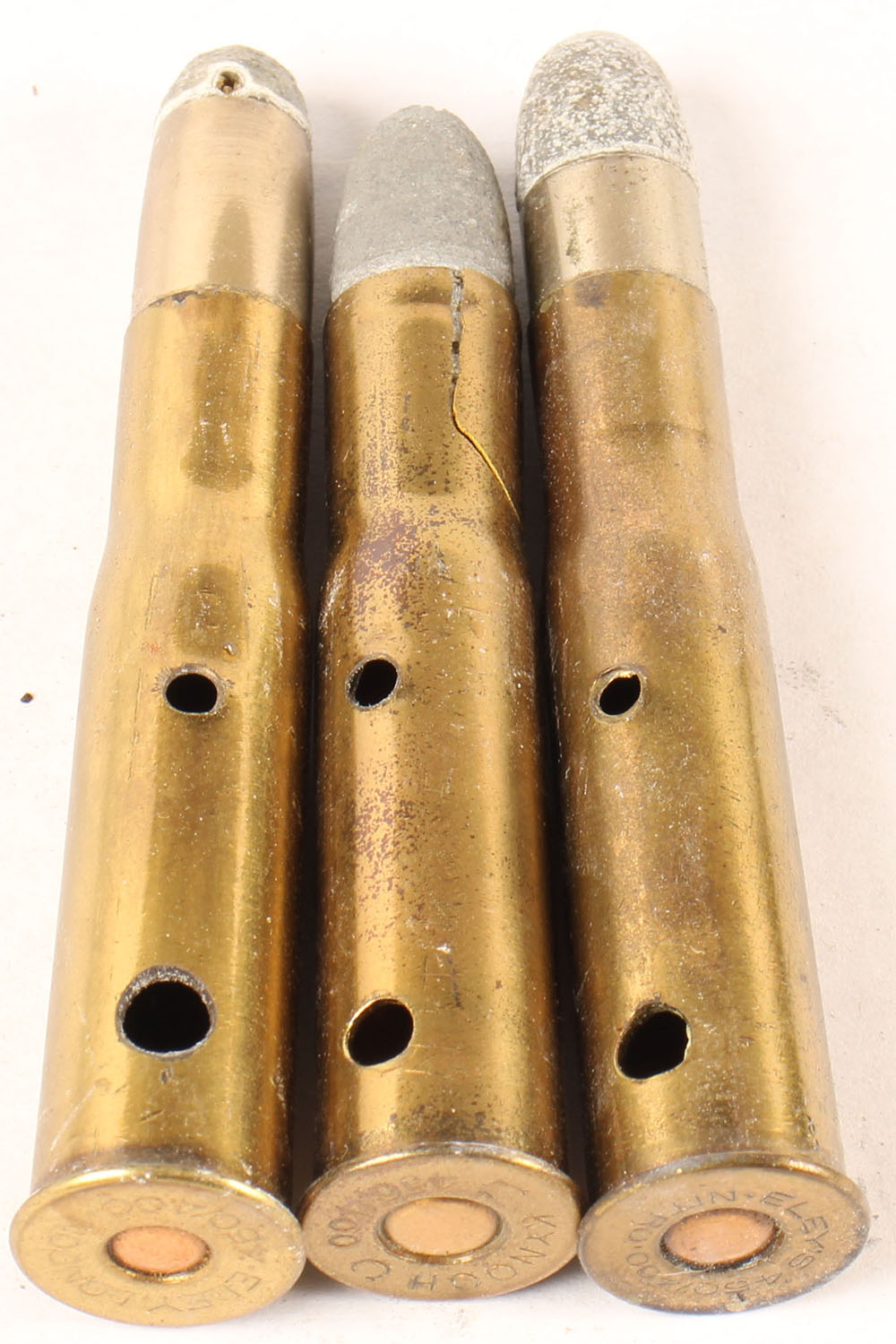 Lot of 3. 450/400 x 23/8'' (1) HS:''ELEY'S 450/400 NITRO'', RN CN SP (large). (1) HS:''ELEY LONDON 450/400'', RN CN SP. (1) KYNOCH C 450/400 L'', RN Lead with copper tube. Neck Crack. All three have two non-factory holes in case. Grade Very Good++ - Value: 10 to 40