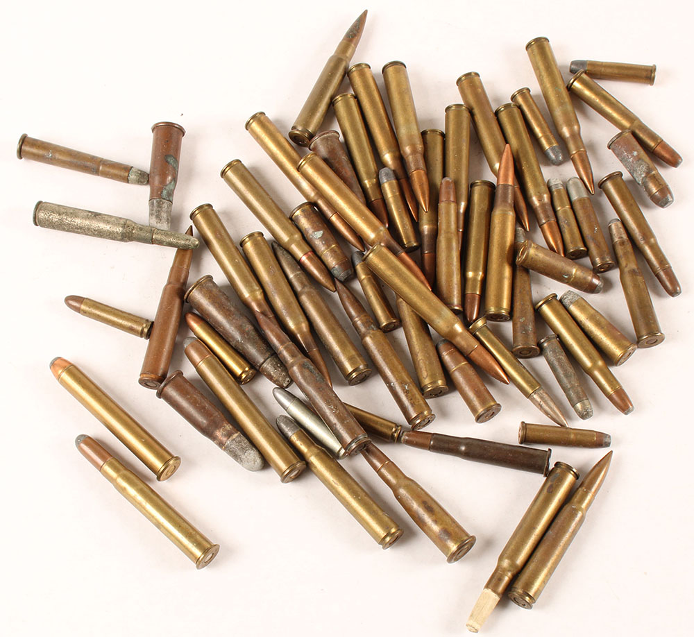 Lot of 60, Miscellaneous Cartridges. Various calibers, headstamps and loadings. (4) 32 Winchester Special, (2) .303 Savage, (7) 32-20 Winchester, (5) 38-40 Winchester, (1) .351 Winchester Self Loader, (2) 8mm Mauser, (2) 32-40, (1) Artillery Primer by WISE (with .30 caliber bullet inserted), (13) .30-06 Military Ball, (2) 8mm Lebel, (1) 7mm Mauser tinned dummy by DM, (7) 7.9x57 German World War I Mauser Ball, (1) 7.7mm Arisaka, (2) 10.4mm Swiss Vetterli, (1) 11mm Egyptian Remington, (1) 35 WCF, (2) .405 Winchester, (1) .30-03 Blank (cream paper), (1) 30-06 Gallery by Remington. (4) .30 Carbine Ball. Grade Good-Very Good - Value: 40 to 80
